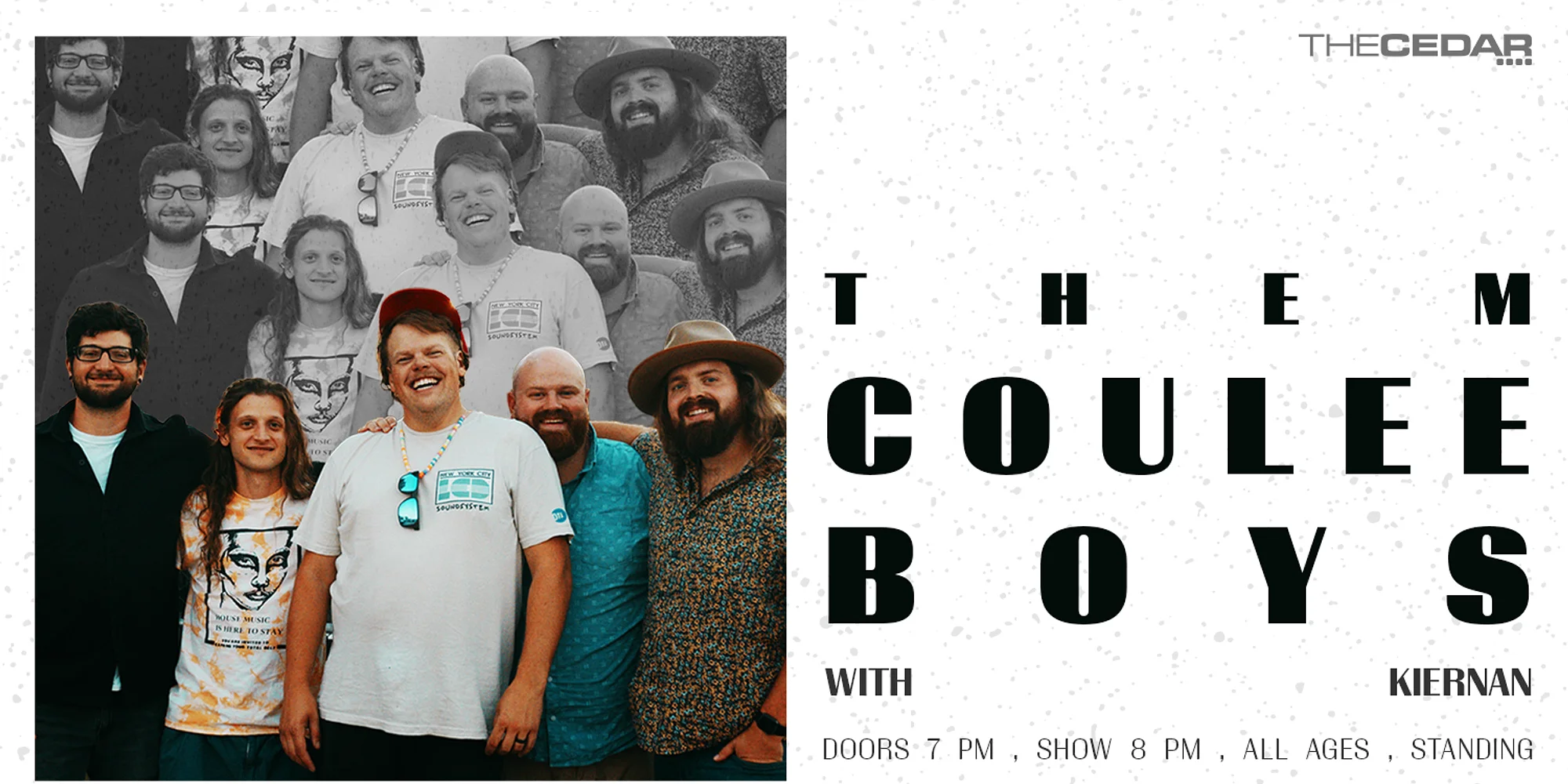The Cedar Presents THEM COULEE BOYS with Kiernan Friday, April 17, 2026 / Doors: 7:00 PM / Show: 8:00 PM All Ages Standing $25 Advance, $30 Day of Show Buy Tickets *For Cedar Presented shows, a $4 facility fee is included in the ticket price (Ticket fee info here). This is a standing show with an open floor. To request seating or other access accommodations, please go to our Access Page. For Cedar presented shows, online ticket sales typically end one hour before the door time, and then, based on availability, tickets will be available at the door. Tickets purchased at the door will include a $1 Eventbrite fee. ABOUT THIS SHOW Them Coulee Boys spent the past decade-plus establishing themselves as one of the Midwest’s premier purveyors of bluegrass and Americana. The Cedar is thrilled to welcome the Eau Claire-based band to our stage for the first time. THEM COULEE BOYS “A rollicking blend of bluegrass, folk, and rock and roll” - Folk Alley Soren Staff and Beau Janke—co-founders of folk/rock/Americana outfit Them Coulee Boys—met as camp counselors in northern Wisconsin in 2011. Their weekend workshopping of Avett Brothers and classic country tunes led to original songs and adding Soren’s brother Jens on mandolin, Neil Krause on electric bass and Stas Hable on drums. The band’s name is a nod to the glacial melt-carved river valleys they call home, known by early French fur trappers as coulees. Known for wild swings of emotion during sets, it is not unusual to see fans in tears and minutes later dancing with abandon. The honesty and ability to talk and sing about the feelings and emotions that shape them has endeared them to a growing group of fans and friends. Over the course of five albums, the band has garnered international attention and earned press in Americana UK, American Songwriter, Ditty TV, Folk Alley, and The Bluegrass Situation. The band has played support to Trampled by Turtles, Los Lobos, Old Crow Medicine Show and Band of Heathens and No Depression writes of the recent release, “a remarkably wide-ranging, enduringly sympathetic examination of the human condition.” 2025 marks the release of No Fun In The Chrysalis, an expansive new collection that finds the band picking up where their 2021 release, Namesake, left off. Goldmine writes "TCB present their material with the presence of War on Drugs and Band of Horses (“Mountains”), but with an intimacy at times of Rick Danko’s best work with The Band ('I Am Not Sad').” The band’s co-founder, Soren Staff, wrote about his ongoing struggles with self-worth and anxiety on “I Am Not Sad,” the first single from the album – “it was a tonic, 4 minutes of musical therapy hearing this for the first time,” claimed Americana UK. The band worked again with Grammy-winning producer Brian Joseph (Bon Iver, Sufjan Stevens, Humbird), whose production on Namesake shepherded the band beyond their folk-grass, Americana roots to “go electric.” No Fun In The Chrysalis was recorded at The H...