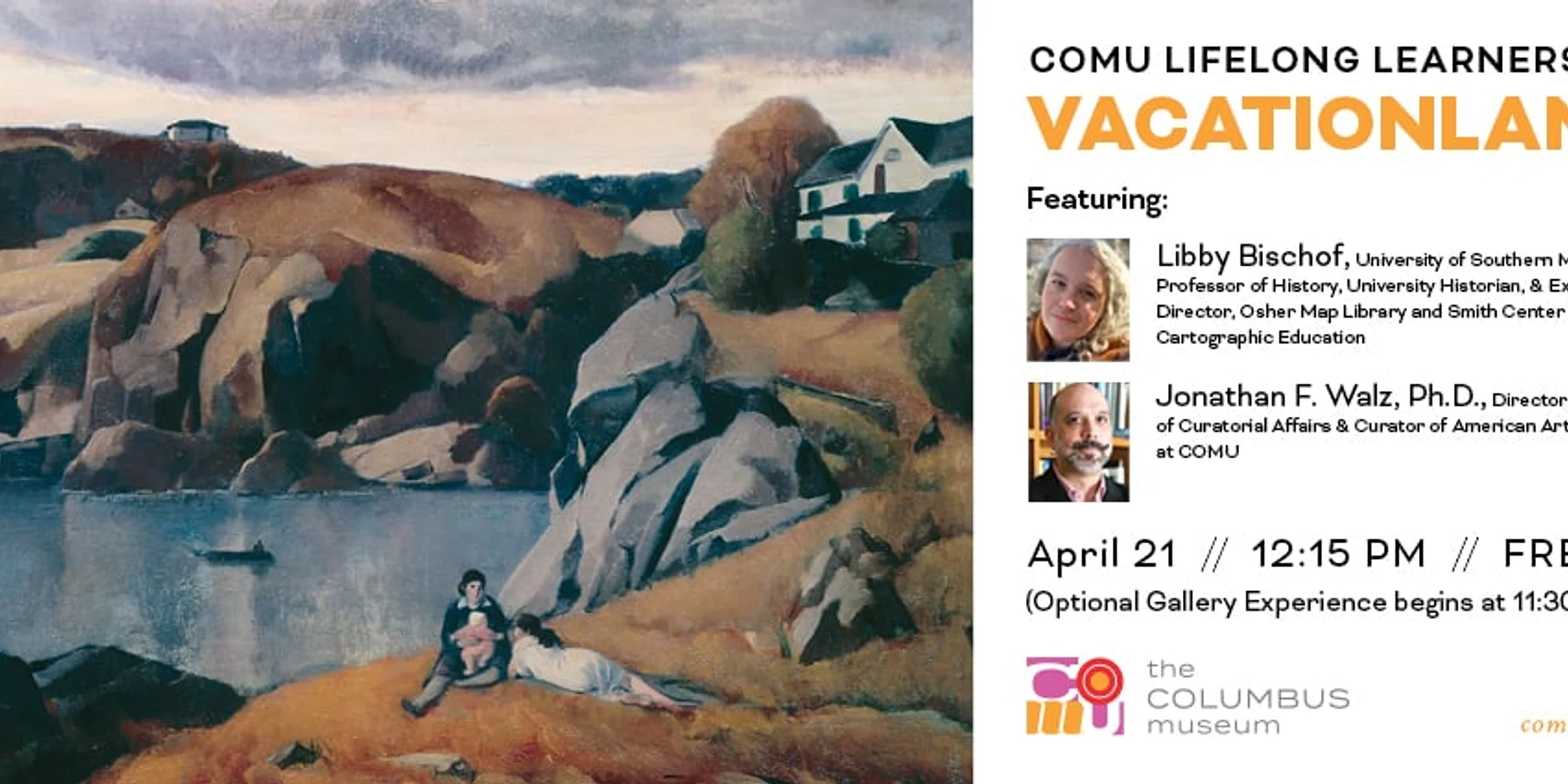 Join us for our monthly lunch lecture series highlighting topics related to objects and exhibitions currently on view at COMU! In April, COMU’s Curator of American Art, Jonathan F. Walz, Ph.D., will talk about the new exhibition VACATIONLAND: American Artists in Maine with added commentary from Libby Bischof, Professor of History and University Historian at the University of Southern Maine and Executive Director of the Osher Map Library and Smith Center for Cartographic Education. Participants have the option to purchase lunch from the Museum’s Café or bring their own.