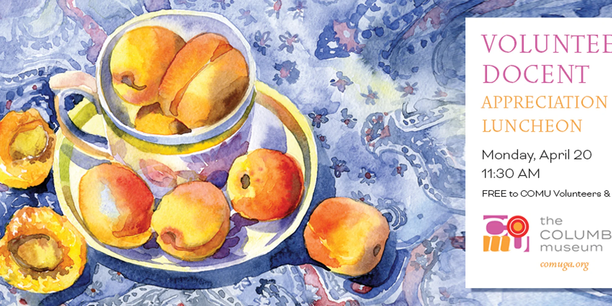 The Columbus Museum invites our volunteers and docents to an appreciation luncheon in thanks for their continued support! Please join us on Monday, April 20 at 11:30 AM for this event in your honor. The lunch will be catered by the Wicked Hen. Please RSVP by April 10 to bking@columbusmuseum.com or by voicemail to 706.748.2562 ext. 2119.