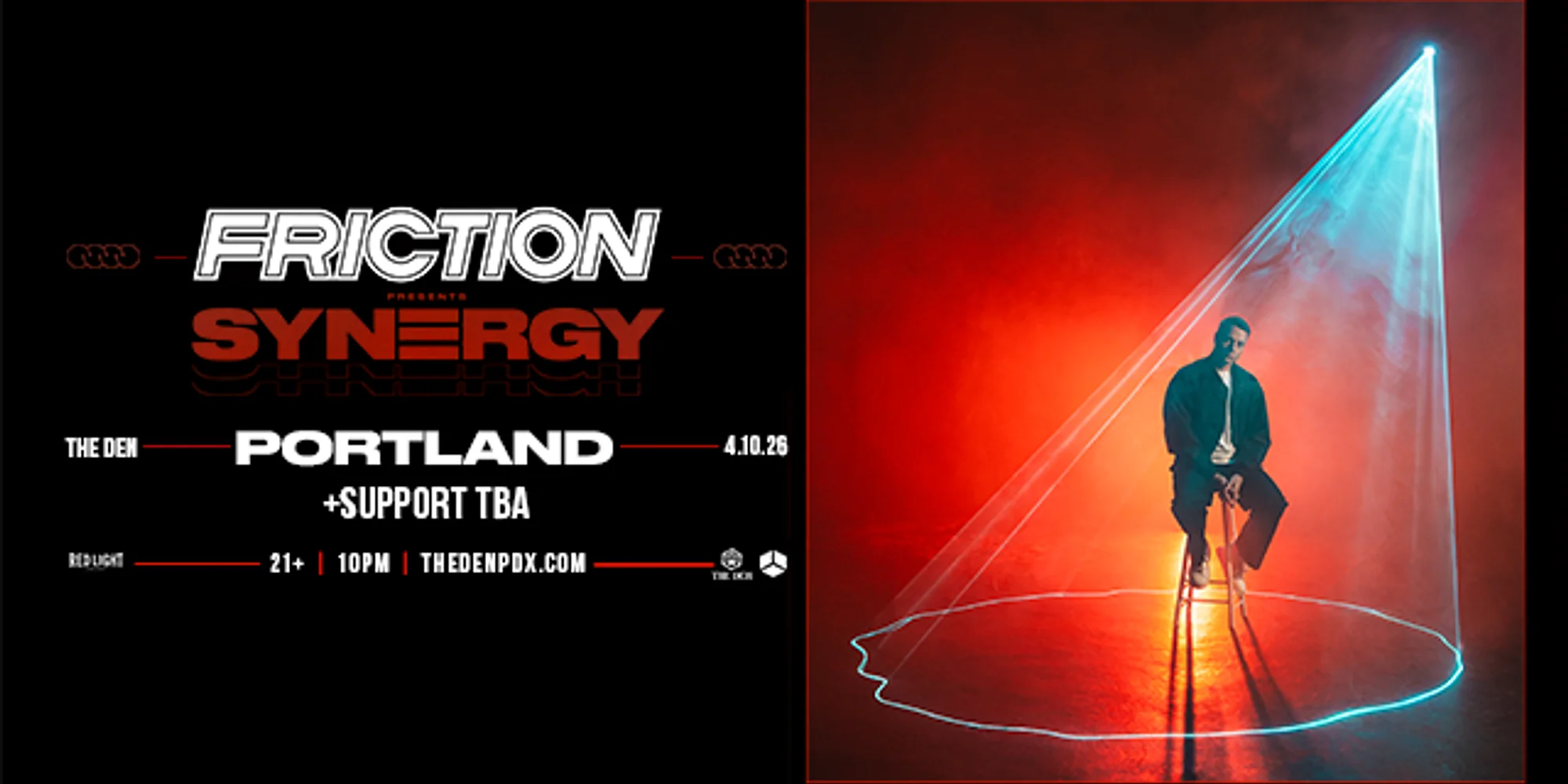 GET TICKETS HERE! Red Cube + The Den Present: FRICTION SUPPORT TBA Tickets go on sale Friday, January 23rd @ 10:00AM! DOORS @ 10:00PM EVENT HOURS: 10:00PM - 2:00AM 21+ w/ Valid I.D. View Upcoming Red Cube Events at: https://www.redcubepresents.com The Den 116 SE Yamhill St. Portland, OR 97217 https://www.thedenpdx.com