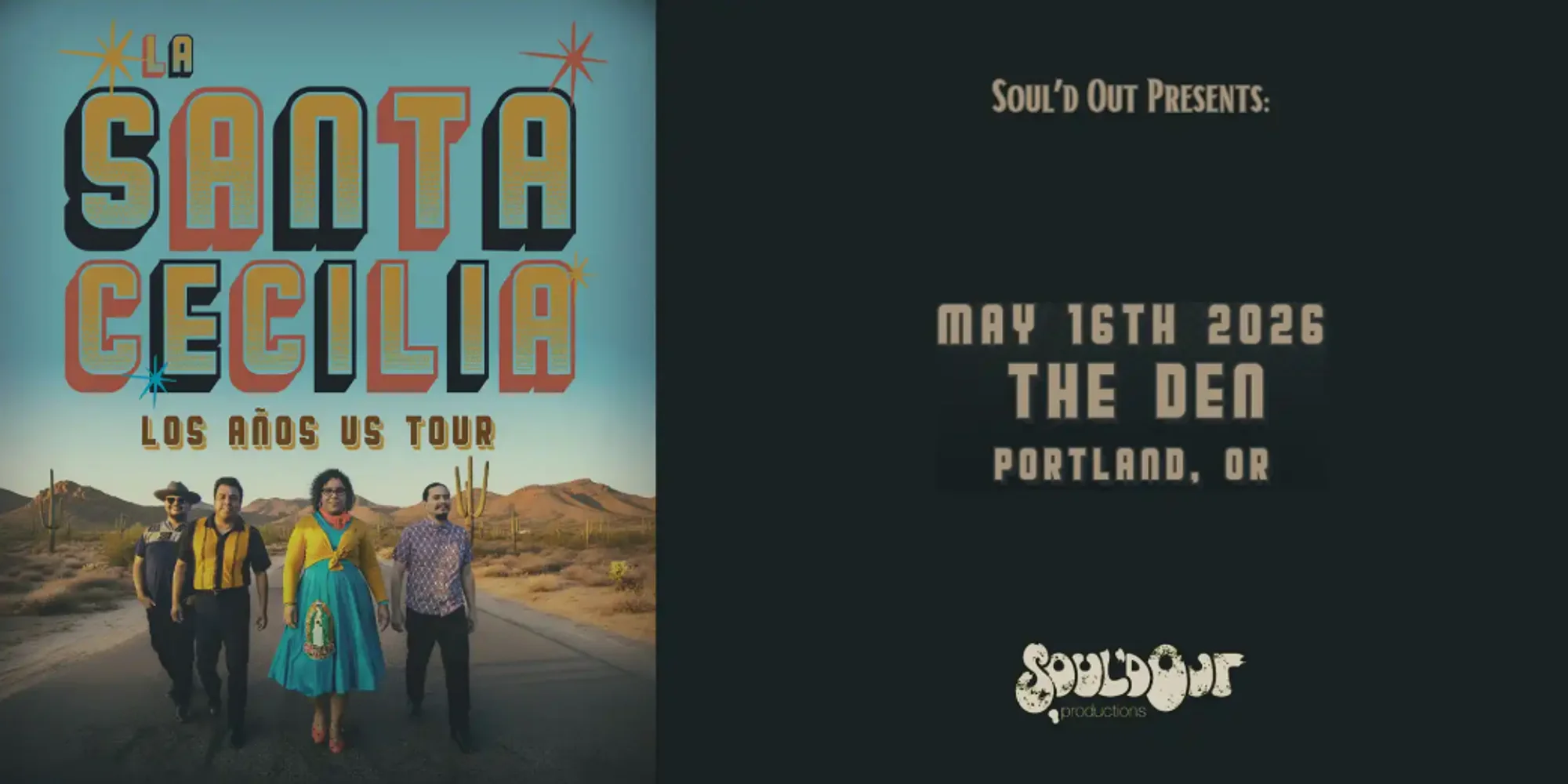 GET TICKETS HERE! Soul'd Out Presents: La Santa Cecilia https://lasantacecilia.com/ Doors at 7:00pm Show at 8:00pm 21+ w/ Valid I.D. The Den 116 SE Yamhill St. Portland, OR 97217 https://www.thedenpdx.com