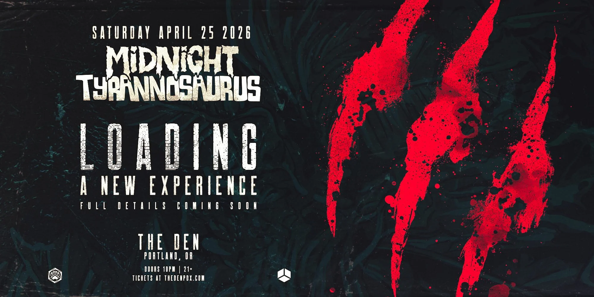 GET TICKETS HERE! Red Cube + The Den Present: MIDNIGHT TYRANNOSAURUS SUPPORT TBA Tickets are on sale Thursday, March 5th at 10:00AM! DOORS OPEN @ 10:00PM EVENT HOURS: 10:00PM - 2:00AM 21+ w/ Valid I.D. View Upcoming Red Cube Events at : https://www.redcubepresents.com/events