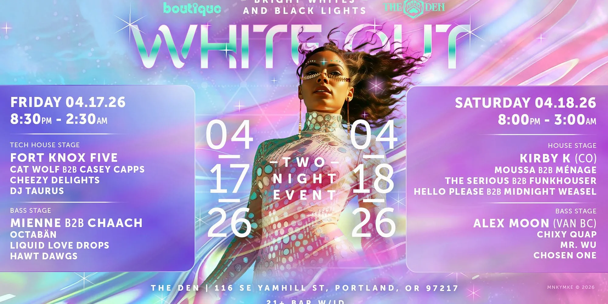 GET TICKETS HERE! ❄ WHITE OUT ❄ A fabulous dance party on two stages in bright whites with black lights. The Boutique will be on hand with a sizzling selection of complimentary White Out ready clothes for those unprepared. Come early for best selection. This is our gift to you! ❄ DETAILS ❄ April 17 & 18, 2025 | Friday 8:30pm - 2:30am | Saturday 8:00pm - 3:00am 2 Stages Each Night ✲ THE DEN | 116 SE YAMHILL, Portland, OR | 21+ event | Please bring ID | Coat check available ❄ FRIDAY | TECH HOUSE STAGE | ❄ FORT KNOX FIVE CAT WOLF & CASEY CAPPS CHEEZY DELIGHTS DJ TAURUS ❄ FRIDAY | BASS STAGE ❄ MIENNE & CHAACH OCTABAN LIQUID LOVE DROPS HAWT DAWGS ❄ SATURDAY | HOUSE STAGE ❄ KIRBY K (Colorado) MOUSSA & MÉNAGE THE SERIOUS & FUNKHOUSER HELLO PLEASE & MIDNIGHT WEASEL ❄ SATURDAY | BASS STAGE ❄ ALEX MOON (Van BC) CHIXY GUAP MR. WU CHOSEN ONE