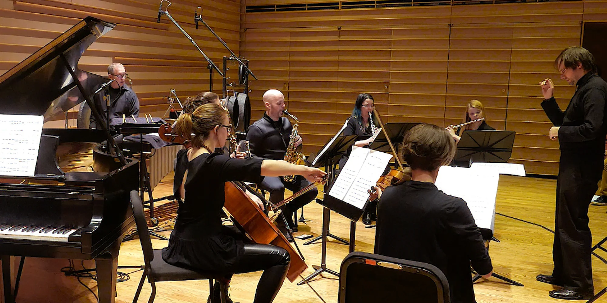 The Tilted Head Ensemble returns to Benzaquen Hall with music by Karen Tanaka, Aníbal Vidal, Amelia Kaplan, Gabriel Bolaños, Jennifer Jolley, Carl Bettendorf, and Scott D. Miller. Kelley Barnett, flute Madison Greenstone, clarinets Benjamin Fingland, bass clarinet Johnna Wu, violin Sofiya Levchenko, violin Stephanie Griffin, viola Thea Mesirow, cello Lucia Stavros, harp Yumi Suehiro, piano Carl Bettendorf, conductor