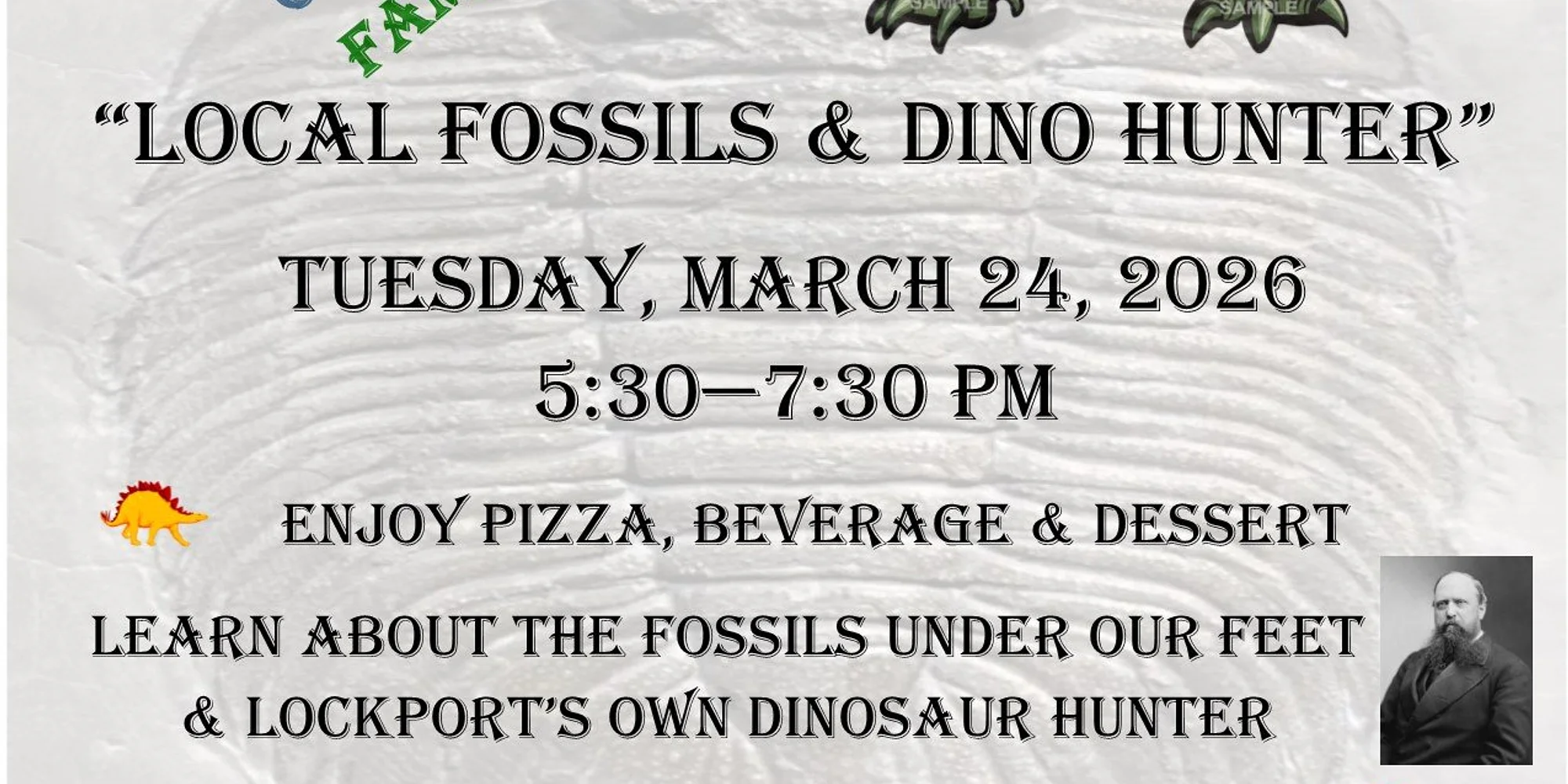 @ “Local Fossils & Dino Hunter” free event with pizza, brief presentation and hands-on activity. Niagara History Center (716)-434-7433 View Organizer Website Add to calendar Google Calendar iCalendar Outlook 365 Outlook Live