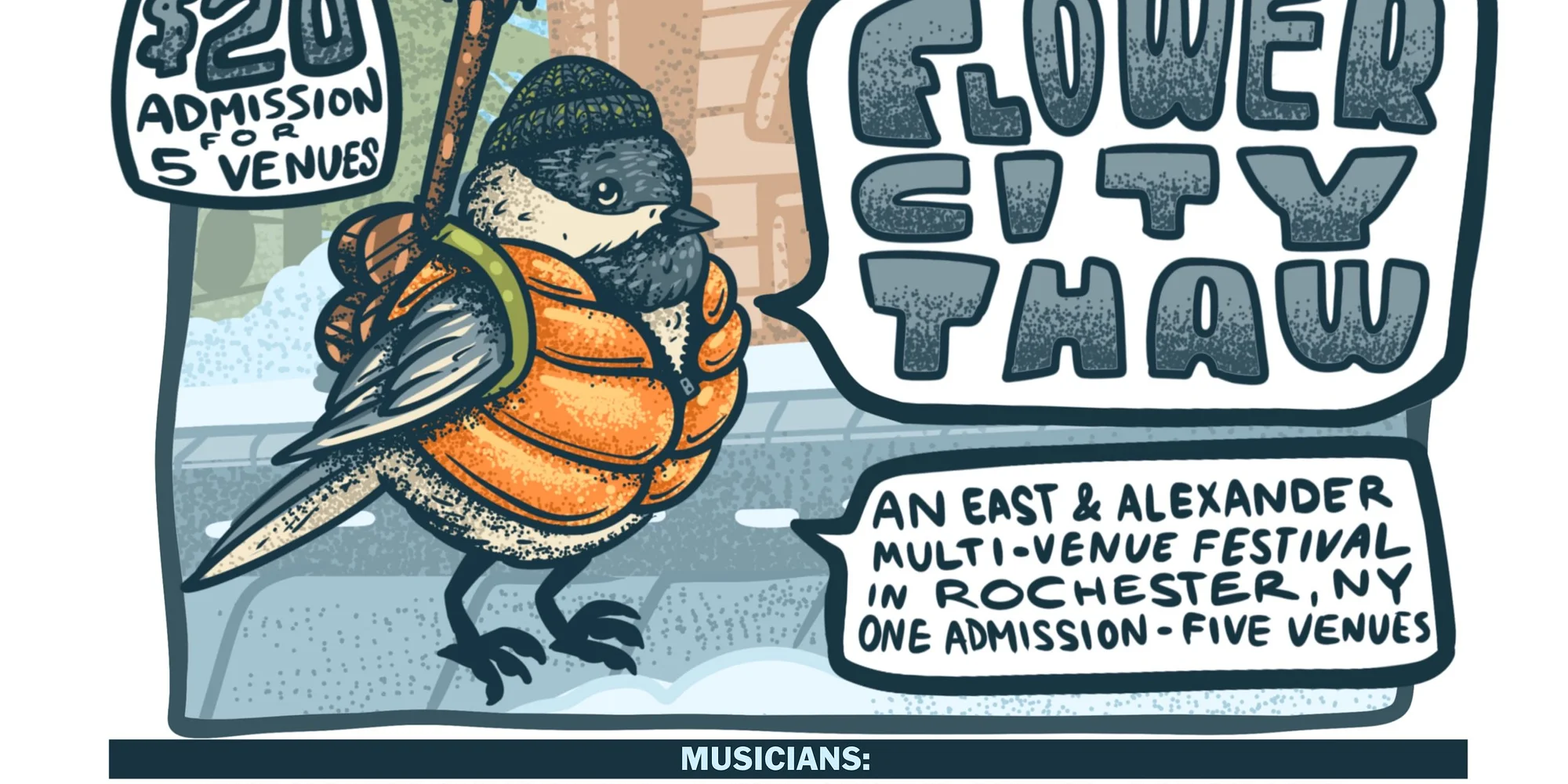 An East & Alexander multi-venue festival in Rochester NY, including the Daily Refresher, Studio Lounge, Fool’s Gold Saloon, Aqua Vitae & Anthology featuring music from A Girl Named Genny, Other Brother, Aaron Lipp, Banjo Juice Jazz Band, The Honey Smugglers, Los Pajaritos, Head to the Roots, The Swooners, Calabash, Rissa the Righter AND MORE