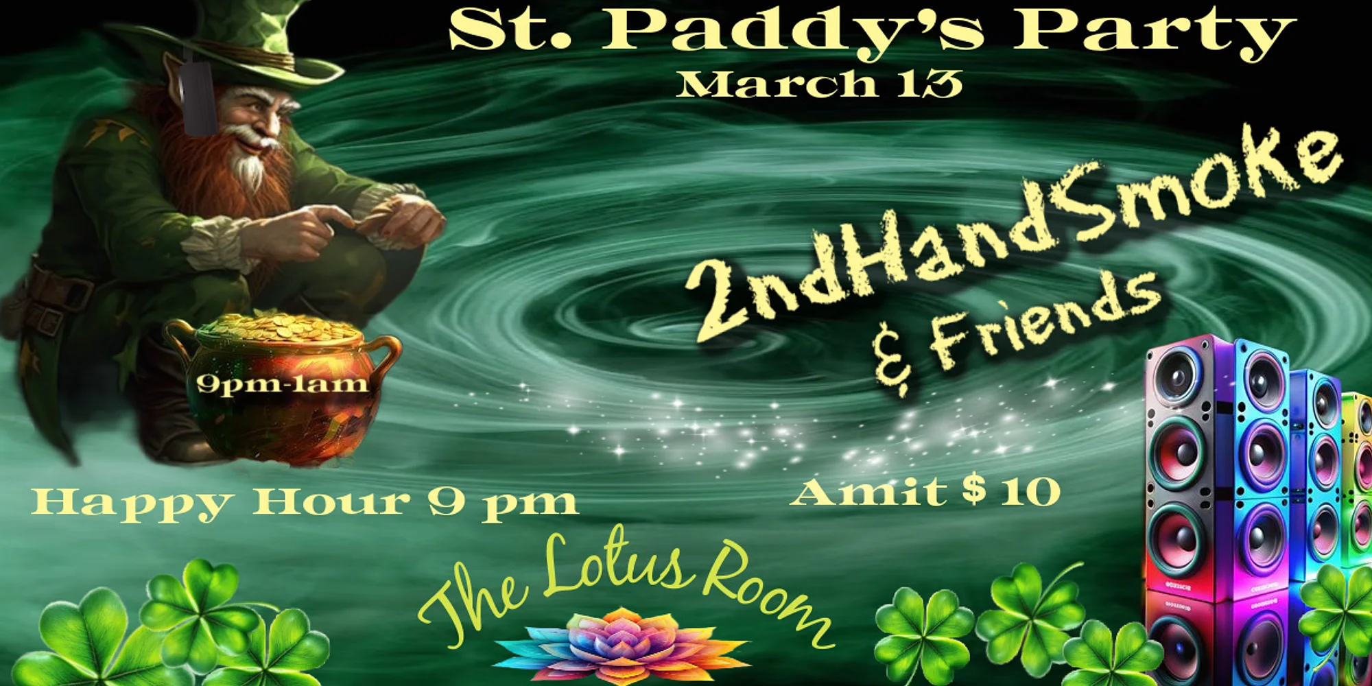Shamrock Shakers & Bass Droppers: You’re Invited!” Grab your green & get ready to dance for 2ndHandSmoke’s St. Paddy’s EDM show. Doors open at 9 pm with Happy Hour. Tickets $10 at lotusroomevents.com or at the door. Enter Lower Venue. Must have ID and be 18 yrs. or older for entry.