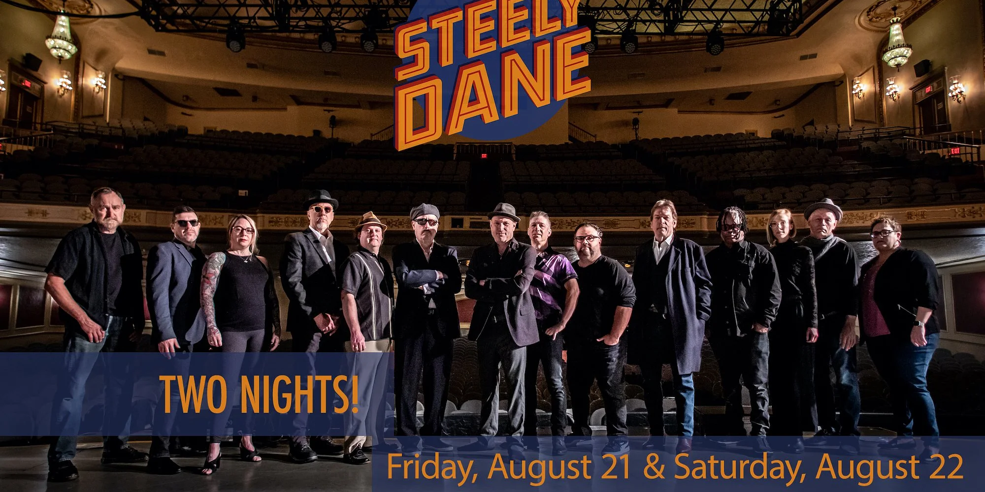Friday, August 21, 2026 & Saturday, August 22, 2026 7 pm Doors // 8 pm Music All Ages $46 ($56.54 w. taxes/fees) Premium Seating $38 ($47.31 w. taxes/fees) Preferred Reserved Seating $30 ($38.07 w. taxes/fees) Advance General Admission Seating $35 ($40 w. taxes/fees) At The Door General Admission *Buy a ticket to BOTH performance, and get 25% off the second night's admission* Ticket purchases are final and non-refundable Facebook RSVP Friday Facebook RSVP Saturday BUY TICKETS // FRIDAY NIGHT BUY TICKETS // SATURDAY NIGHT Steely Dane, the ultimate Steely Dan tribute, returns to The Parkway for a two-night stint celebrating this legendary band's iconic catalog. Steely Dane faithfully reproduces the songs of legendary rock and jazz artists Steely Dan and Donald Fagen. Each night will feature classic hits and deep cuts—a guaranteed different set list each night! Attend both nights and get 25% off your tickets for the second night! “THE LARGE ENSEMBLE FILLS THE HALL WITH SOUL AND SMARTS. IT’S A BIG BAND WITH A BIG SOUND, AND IT’S DAMN NEAR PERFECT.” — JOHN ROACH, MADISON MAGAZINE Winner of multiple MAMA (Madison, Wisconsin) awards for best cover band, Steely Dane is dedicated to not only faithfully reproducing the songbooks of Steely Dan and Donald Fagen, but to bringing an energetic live-show experience to audiences. Sixteen of Wisconsin's best jazz and rock musicians have banded together through their shared passion for Steely Dan music, playing in the same configuration as the Steely Dan touring band including a four-piece horn section, two background singers, two guitars, two keyboards, bass, drums and percussion. Performances consist of hits and deep cuts and sometimes even complete albums. Be ready to dance and sing along. Website // Facebook // Instagram