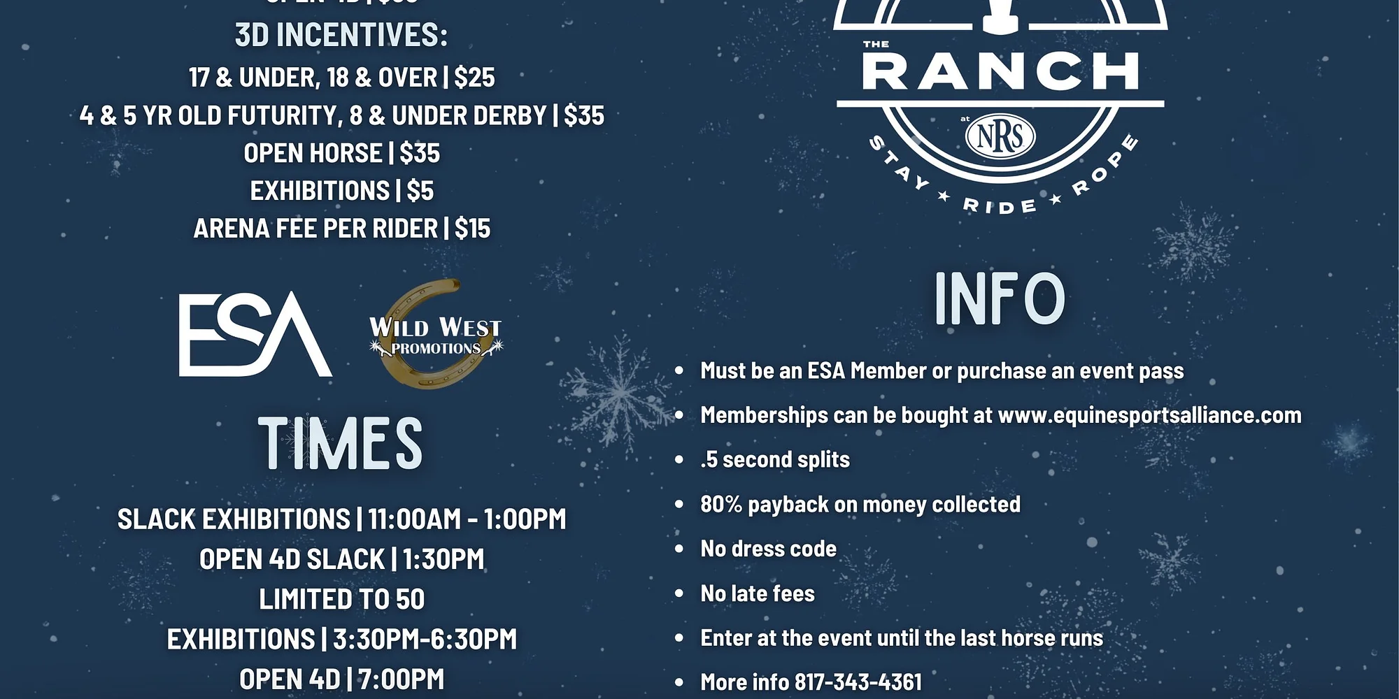 INFO Must be an ESA member or purchase an event pass Memberships available at www.equinesportsalliance.com .5 second splits 80% payback on money collected No dress code No late fees Enter at the event until the last horse runs More info: 817-343-4361