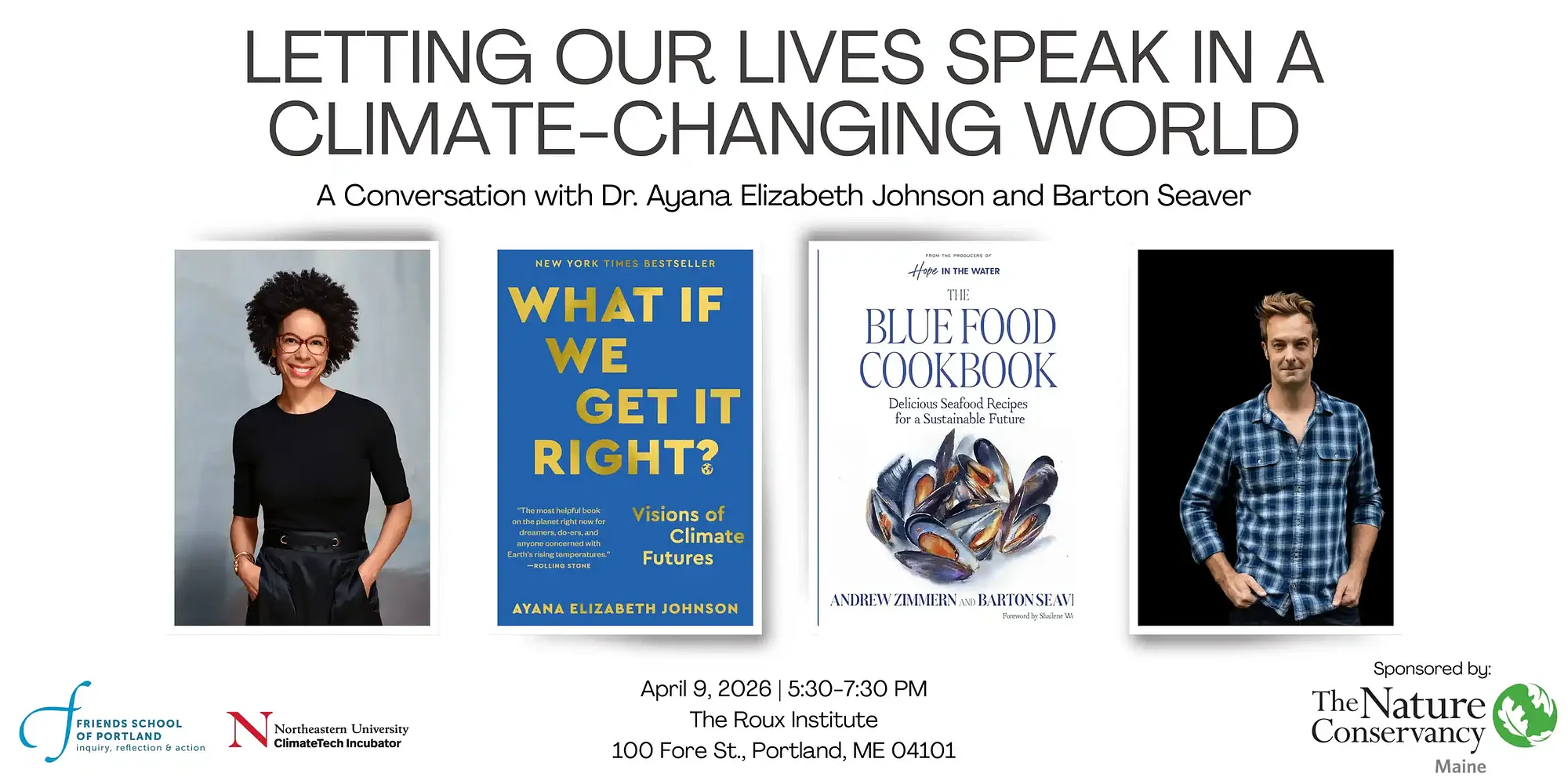 In this special conversation presented in partnership with the Parenting for Peace series, marine biologist and climate policy expert Dr. Ayana Elizabeth Johnson joins chef, author, and sustainable food systems advocate Barton Seaver for a powerful and deeply personal conversation about living with intention in a time of climate change. Drawing on the Quaker framing of “letting your life speak,” Ayana and Barton will explore how our values, as expressed through the food we serve, the work we choose, the conversations we hold at the dinner table, and the communities we build, shape the world we all inherit. Together, they bring perspectives from science, food systems, ocean stewardship, and parenthood to ask: What does it mean to model courage, hope, and responsibility in uncertain times? This evening will weave together dialogue, reflection, and audience engagement, offering practical inspiration for anyone seeking to align daily life with planetary well-being. Join us for an energizing and hopeful gathering. Doors open at 5:30 pm. Guests are invited to mingle, enjoy light refreshments, and music before the presentation. Following the conversation, Barton and Ayana will sign books. If you are interested in pre-reserving one of Ayana’s or Barton’s books, you will be able to do so in the event checkout page. Limited additional books will be available for purchase on-site. This event is co-hosted by: The ClimateTech Incubator, based at Northeastern University’s Roux Institute campus in Portland, Maine, is a hub for climatetech startups. In addition to desk and prototyping space, members have access to Northeastern’s global network of mentors, researchers, and students, as well as the Roux Institute’s curated network of entrepreneurs, investors, and corporate partners. Members also benefit from a robust program of guest speakers, networking events, access to professional services, and more. The Friends School of Portland is an independent Quaker day school for students in preschool through eighth grade. As a small school, FSP offers cooperative, hands-on learning in a close community where simplicity, service, stewardship, and peaceful resolution of conflict are practiced every day. This event is sponsored by: The Nature Conservancy in Maine The Nature Conservancy is a global environmental nonprofit working to create a world where people and nature can thrive. Founded in the U.S. through grassroots action in 1951, The Nature Conservancy (TNC) has grown to become one of the most effective and wide-reaching environmental organizations in the world. Thanks to more than a million members and the dedicated efforts of our diverse staff and over 1,000 scientists, we impact conservation in 83 countries and territories: 39 by direct conservation impact and 44 through partners.