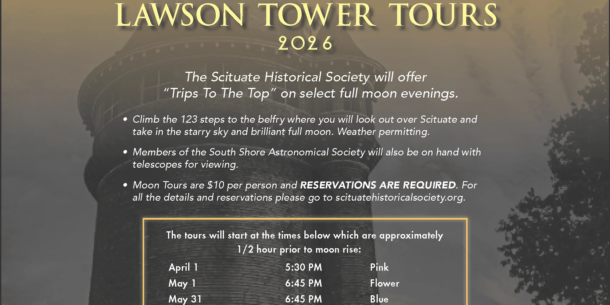 The Scituate Historical Society will offer “Trips To The Top” on select full moon evenings. Climb the 121 stairs to the belfry where you will look out over Scituate and take in the starry sky and bright full moon. Members of the South Shore Astronomical Society will be on hand with telescopes for viewing. Moon Tours are $10 per person. RESERVATIONS ARE REQUIRED and may be made on line below. Email GAR Hall Events with questions. These tours will start at the times below which are approximately 1/2 hour prior to sunset weather permitting: April 1, 5:30 PM, Pink Moon May 1, 6:45 PM, Flower Moon May 31, 6:45 PM, Blue Moon June 29, 7:15 PM, Strawberry Moon July 29, 6:45 PM, Buck Moon August 28, 6:00 PM, Sturgeon Moon September 27, 5:15 PM, Corn Moon October 26, 4:15 PM, Harvest Moon November 24, 3:30 PM, Beaver Super Moon December 23, 3:15 PM, Cold Super Moon This program sponsored in part by a grant from the Mass Cultural Council, supporting cultural opportunities throughout the Commonwealth.