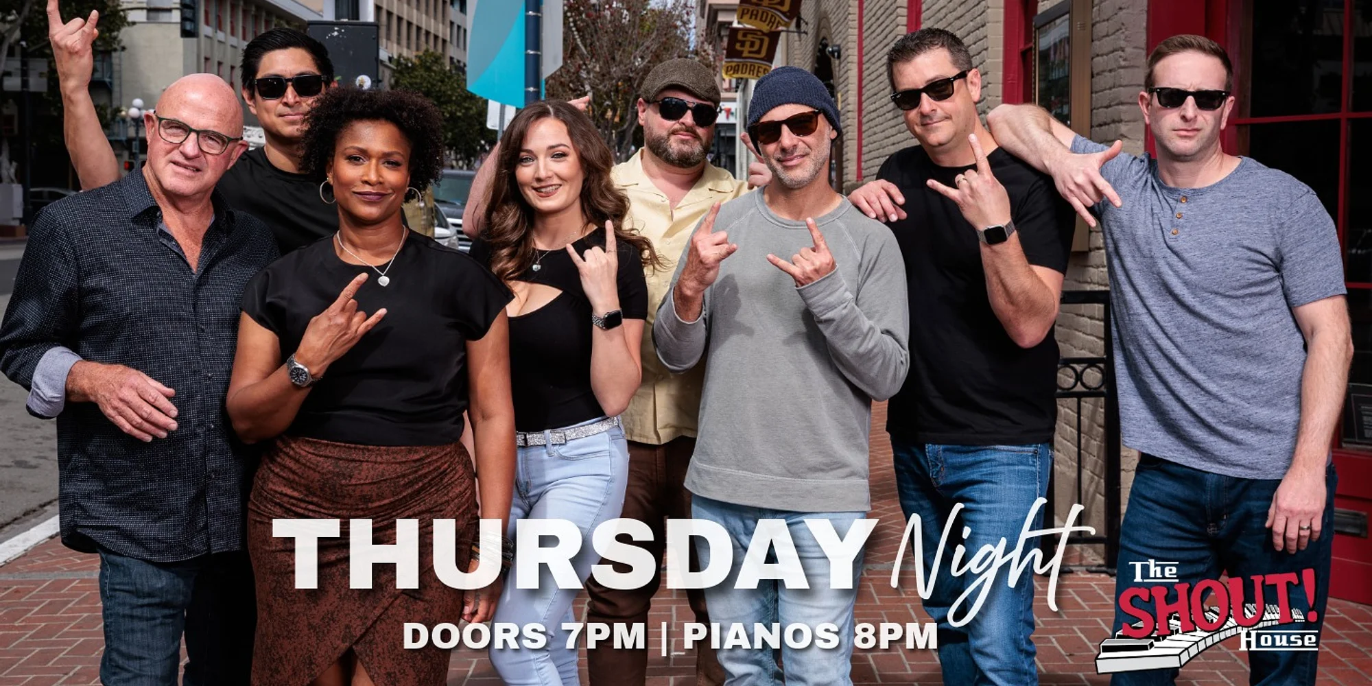 THURSDAY NIGHT – Doors 7pm | Pianos 8pm | 21+ Looking for the best dueling pianos show in San Diego on Thursday night? Every Thursday, The Shout! House in the Gaslamp Quarter delivers one of the most interactive live music experiences in downtown San Diego. Our high-energy dueling piano show features talented entertainers performing on grand pianos while the audience sings along, requests songs, and becomes part of the show. Whether you’re planning a night out in the Gaslamp Quarter, celebrating a birthday, or searching for live music in San Diego on Thursday night, The Shout! House offers a one-of-a-kind nightlife experience filled with music, laughter, and unforgettable moments. SHOUT ENTERTAINERS: Dave, Jon, James TABLE RESERVATIONS Reservations available from 7:00pm – 7:45pm. No reservations accepted after 7:45pm. Reservation fee: $5 per guest for guaranteed seating. Guests included in reservations are not charged cover upon arrival. RESERVATIONS VIP PACKAGES WALK-INS Welcome! FREE cover every night with college or military ID* *State-issued ID also required. The Best Dueling Piano Show in San Diego When it comes to live music and nightlife in San Diego, The Shout! House is one of the Gaslamp Quarter’s most exciting destinations. Our renowned dueling piano show features two talented performers playing face-to-face grand pianos in a high-energy, request-driven performance that keeps the crowd entertained all night long. Expect sing-alongs, comedy, audience participation, staff dancing on stage, and music ranging from classic rock anthems to today’s biggest hits. No two shows are ever the same — the audience helps create the experience. Private Events & Group Parties Planning a birthday party, corporate event, bachelor or bachelorette celebration, or group night out in San Diego? The Shout! House is one of the most unique private event venues in the Gaslamp Quarter. Enjoy live entertainment, delicious food, craft cocktails, and a high-energy atmosphere your guests will never forget. Reserve your table today and Laugh, Sing & Shout the night away.