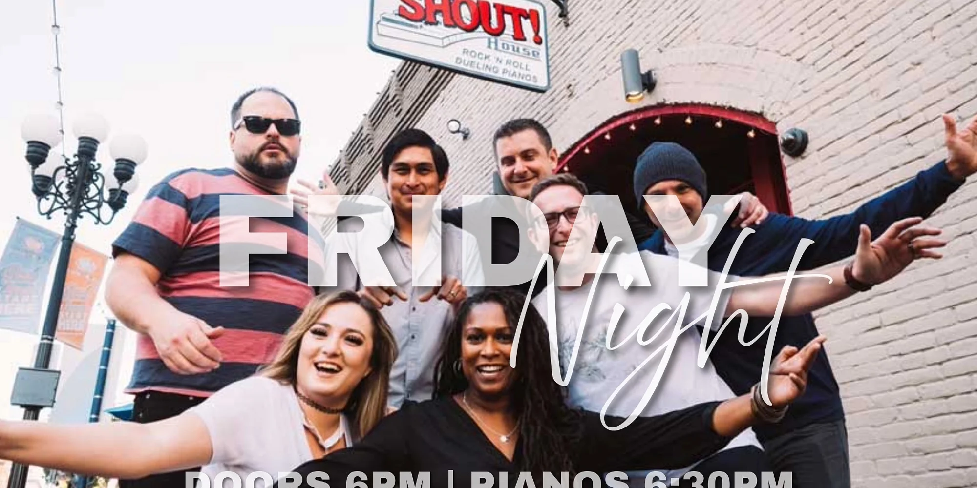 FRIDAYS at The Shout! House – Doors 6pm | Pianos 6:30pm FRIDAY FORECAST: FUN!! Kick off your weekend with high-energy dueling pianos, great drink deals, and no cover during prime hours. 1/2 OFF Cover for Walk-Ins 10-11pm ½ OFF Domestic Bottles & Seltzers 10-11pm SHOUT ENTERTAINERS: Martha, Jon, Dave, James TABLE RESERVATIONS Reservations from 6:00pm – 6:45pm, no reservations after 6:45pm. Parties smaller than 4 will be seated at the rail, based upon availability. $15/ reservation fee per guest for guaranteed seating. Guests included in reservations are not charged cover upon arrival. TABLE RESERVATIONS VIP PACKAGES When it comes to live music and unforgettable experiences in San Diego, CA, The Shout! House delivers excitement like no other. Our renowned dueling piano show features two talented performers at face-to-face grand pianos, creating an electric atmosphere that keeps the party alive all night long. With a repertoire spanning from classic rock anthems to modern hits, our show is fueled by your requests, ensuring every performance is unique and interactive. Add staff dancing on stage, audience participation, comedy, and sing-alongs, and it’s clear why we are the go-to destination for live entertainment. EXPERIENCE UNMATCHED LIVE ENTERTAINMENT AT THE SHOUT! HOUSE Looking for a unique private event space? The Shout! House is the ideal choice for hosting memorable private parties. Whether it’s a celebration with friends, a corporate event, or a special occasion, our venue offers the perfect combination of entertainment, delicious food, and fun drinks. Enjoy a lively and engaging atmosphere that leaves your guests raving about the experience. Reserve your tables today to experience San Diego’s best live music venue. It’s time to Laugh, Sing & Shout the night away—book now!