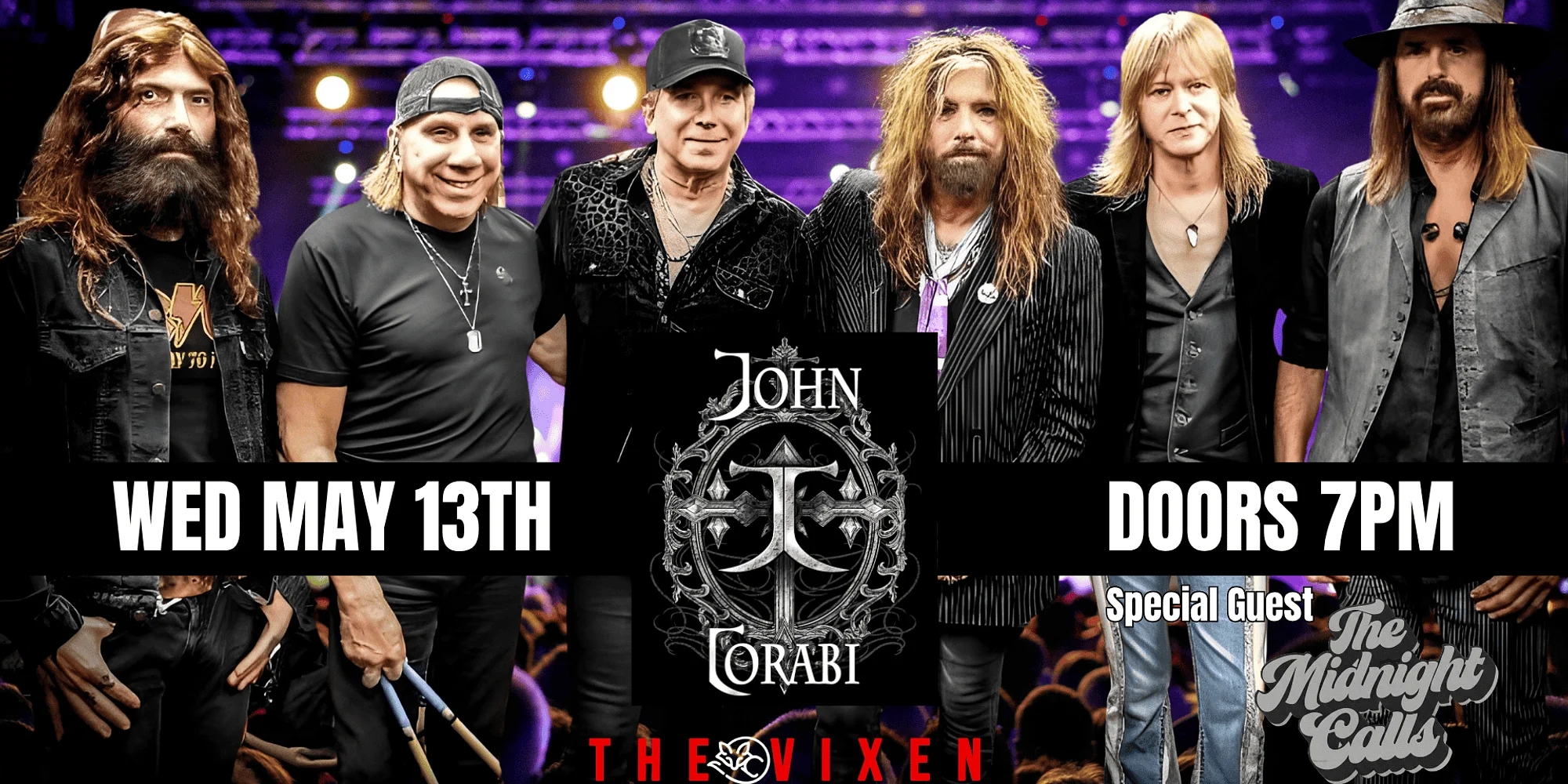 JOHN CORABI W/ SPECIAL GUESTS: THE MIDNIGHT CALLS WEDNESDAY, MAY 13TH DOORS OPEN AT 7PM ALL AGES SHOW TICKETS: VIP Club Presale: Wed Feb 18 @ 10am Public Sale: Thurs Feb 19 @10am JOHN CORABI & FRIENDS: John Corabi the former singer/songwriter of The Scream, Mötley Crüe, and current singer of The Dead Daisies, has joined forces with some of his seasoned longtime friends to help play an assortment of songs from his past and current catalogue spanning 35 years. Joining John onstage for his “New Day 2025-26 tour” are … Paul Taylor (keyboards/guitar/vocals) a founding member of Winger, as well as Alice Cooper, Steve Perry, and Eric Martin. Paul lent his keyboard talents to several of the songs on John’s new record “New Day,” and volunteered to come join on stage. Jeremy Asbrock (lead guitar/vocals) Jeremy has toured with John during the “Live 94 tour” in 2014-15, and also played for The Gene Simmons band, as well as Ace Frehley for the last few years. So having Jeremy back on the guitar, and vocals, was John’s first choice and makes perfect sense. Michael Devin (bass/vocals) John has known Michael for 20+ years, and also has the pleasure of sharing stages with him in The Dead Daisies. Michael spent a dozen years touring and recording with David Coverdale’s Whitesnake, and now lends his bass and vocal talents to John’s live shows Troy Luccketta (drums) At the suggestion of Michael Devin, John phoned Troy of Tesla, Keith Emerson, Eric Martin fame, and asked if he’d be interested in touring with this new lineup. After hearing the “New Day” record, Troy jumped in with both feet and has become the emotional driving force as well as the backbone of the songs live. Marti Frederiksen (guitar/vocals/percussion) Marti is a world renowned producer/songwriter/guitarist/ and vocalist, and has been the creative weapon for The Dead Daisies albums “Make Some Noise,” “Burn It Down,” and “Light Em’ Up.” He is the lead vocalist of the fictitious Stillwater band in the movie “Almost Famous,” as well as a cowriter for the song “Jaded,” with Aerosmith. Marti has written/produced bands like Gavin Rossdale, Mötley Crüe, Ozzy Osbourne, Def Leppard, as well as country artists Faith Hill and Carrie Underwood. As well as playing with John live, Marti cowrote and produced all of the songs on John’s record “New Day” As you can see “John Corabi and Friends” has got a long pedigree in the music industry, and the guys are excited to get out on stages and perform around the world. Currently in rehearsals things are sounding great, and they’re looking forward to get to a venue near you soon!!!