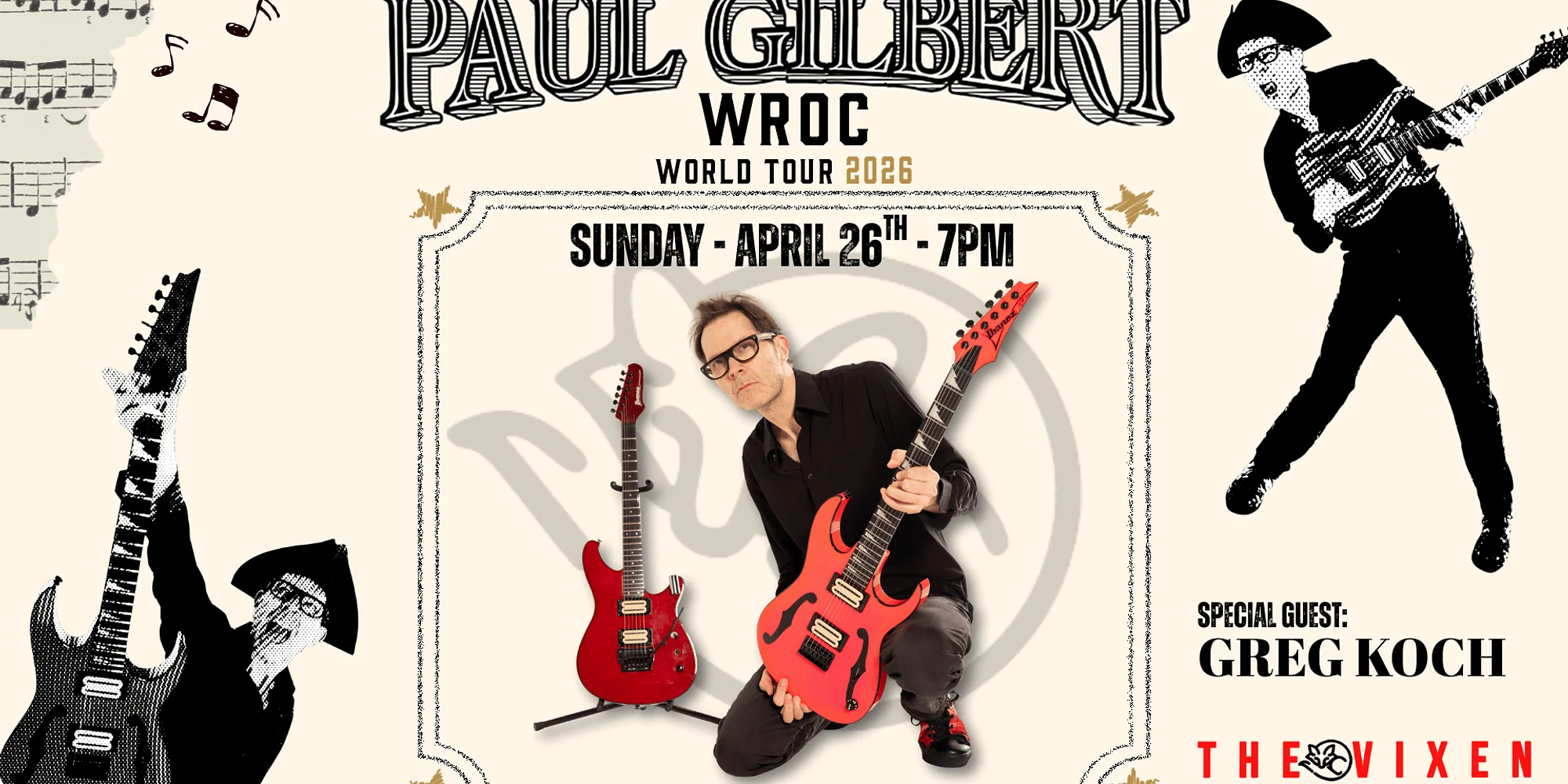 PAUL GILBERT W/ SPECIAL GUEST GREG KOCH SUNDAY, APRIL 26TH DOORS OPEN AT 7PM ALL AGES SHOW TICKETS: VIP Club Members Presale- Fri Jan 16 @ 10am Public sale: Sat Jan 17 @ 10am In Mr. Big, he was responsible for pioneering pop rock anthems that saw the group top charts and headline arenas around the world. In Racer X, he pushed the electric guitar to its furthest limits, in a more metallic direction, leaving listeners and audiences mesmerized by how his compositons could be so technically thrilling and tastefully musical at the same time. As a solo artist, he’s traversed both instrumental and vocal-led sonic landscapes that have crossed over from blues, classical and jazz to straight-up rock. The technical chameleon and guitar virtuoso Paul Gilbert recently announced his new album, WROC, which will be released on 27 February via Music Theories Recordings. To celebrate, he has revealed the music video for Go Not Thither. WROC, which stands for “Washington’s Rules of Civility,” could very well be the guitar superstar’s most outlandish offering to date. Using George Washington’s Rules of Civility as a conceptual homing beacon, Gilbert has dared himself to think outside the box and use an etiquette guide dating back to the late 1500s as his main source of inspiration. GREG KOCH: It is not a stretch to say that Milwaukee native Greg Koch is one of the most famous unknown guitar players in the world. His fierce creative spirit and crazed sense of fun fused with a tremendous degree of versatility has made him an island of six-stringed mirth in a sea of guitar warlords. Fifteen critically acclaimed CD’s featuring his unique and incendiary brand of playing and composing, international tours as band leader, fourteen best-selling guitar instructional materials for the Hal Leonard Publishing empire, articles and columns in some the biggest guitar magazines, a lengthy past tenure as an ambassador for Fender Guitars and a similar position in that capacity for Fishman Transducers has generated a respectable following for Greg throughout the world. Ultimately, Greg’s 4000 plus videos exceeding 50 million views for Wildwood Guitars of Louisville Colorado showcasing Greg’s wild guitar test drives and random humorous commentary have made him a household name for guitar players throughout the galaxy.
