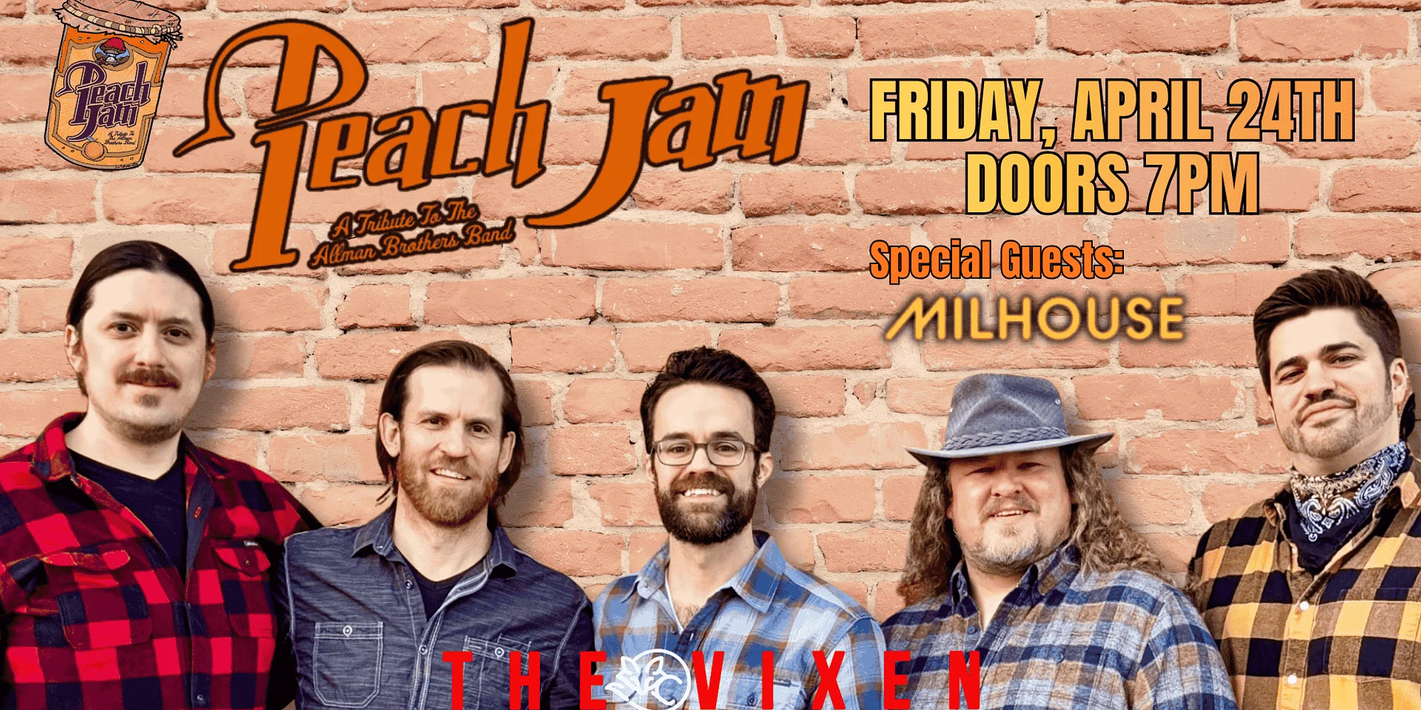 PEACH JAM – A TRIBUTE TO THE ALLMAN BROTHERS BAND W/ SPECIAL GUESTS: MILHOUSE FRIDAY, APRIL 24TH DOORS OPEN AT 7PM ALL AGES SHOW TICKETS: VIP Club Members Pre-Sale – Fri Mar 6th @ 10am Public Sale – Sat Mar 7th @ 10am Peach Jam is a collective of some of the best musicians Chicago has to offer celebrating the music of the legendary Allman Brothers Band. Formed in 2022, these players will transport you back in time to the Fillmore East and keep you moving all night long. Peach Jam brings together members of Chicago mainstays Cornmeal, Terrapin Flyer, Old Shoe, Helping Phriendly Orchestra, and the Brooklyn Charmers for a cosmic gumbo of hot jams, tight grooves, soaring vocal harmonies, and down-home blues that’ll make a believer out of any ABB fan. “People can you feel it? Love is everywhere!”