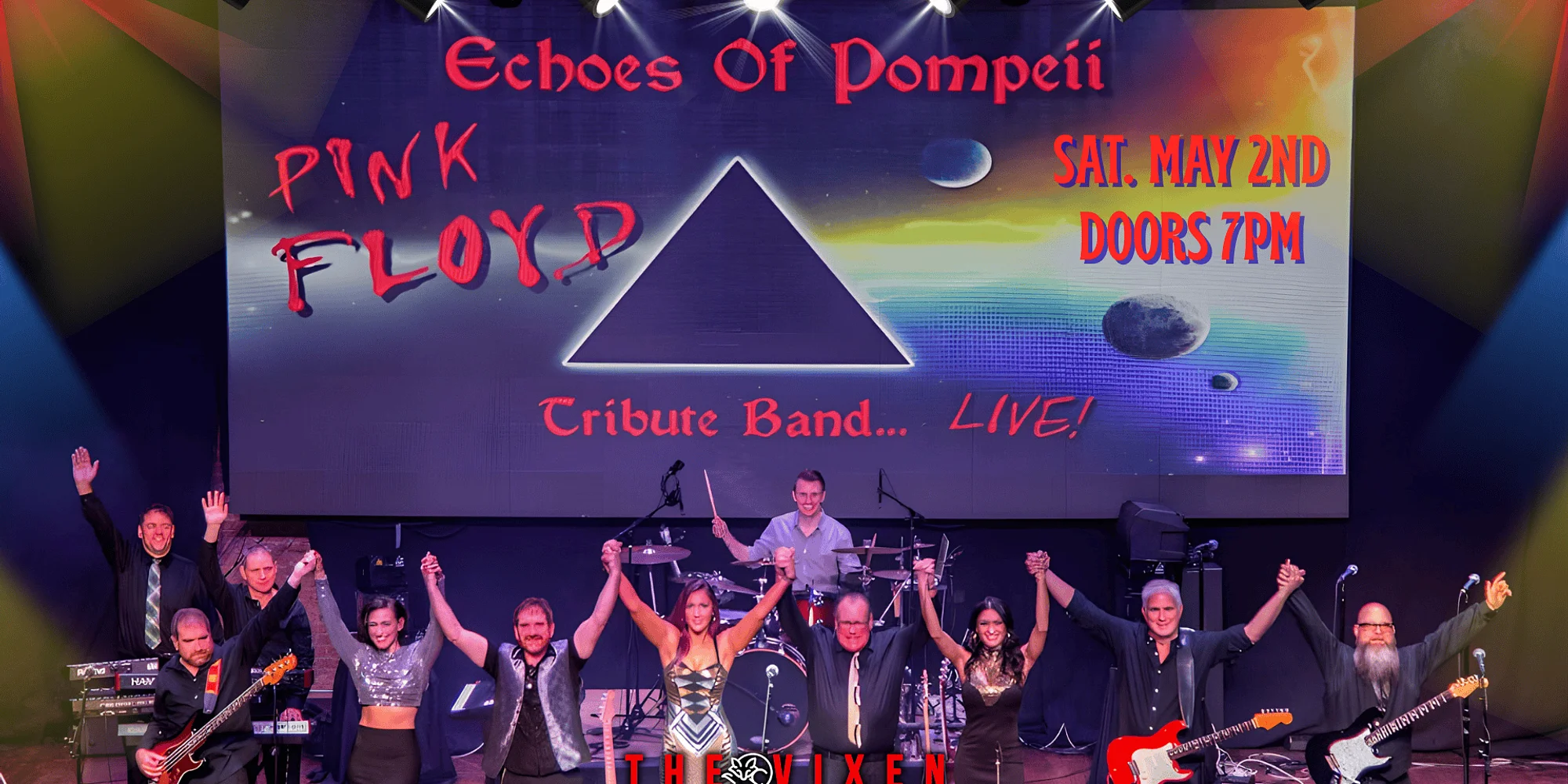 PINK FLOYD TRIBUTE – ECHOES OF POMPEII SATURDAY, MAY 2ND DOORS OPEN AT 7PM ALL AGES SHOW TICKETS: VIP Club Pre-Sale Tues Feb 10 @ 10am Public Sale Wed Feb 11 @ 10am About Echoes of Pompeii Echoes of Pompeii is comprised of a 11 piece band (orchestra) to give fans the true sound of a Pink Floyd concert. From synthesizers, delayed vocals, slide guitars and female back up singers, we leave no stone unturned, when it comes to our sound. We will grab you with our state of the art visuals such as lasers, lights, video, and iconic images that Pink Floyd was well known to produce. We play all eras of Pink Floyd from the early Syd Barrett days, to the later exclusion of the Roger Waters era, and everything in between. So let us take you back in time when we were all young and listening to the best music and making the best memories. As Vera Lynn once sang, “We’ll meet again, Don’t know where, don’t know when, But I know we’ll meet again some sunny day”
