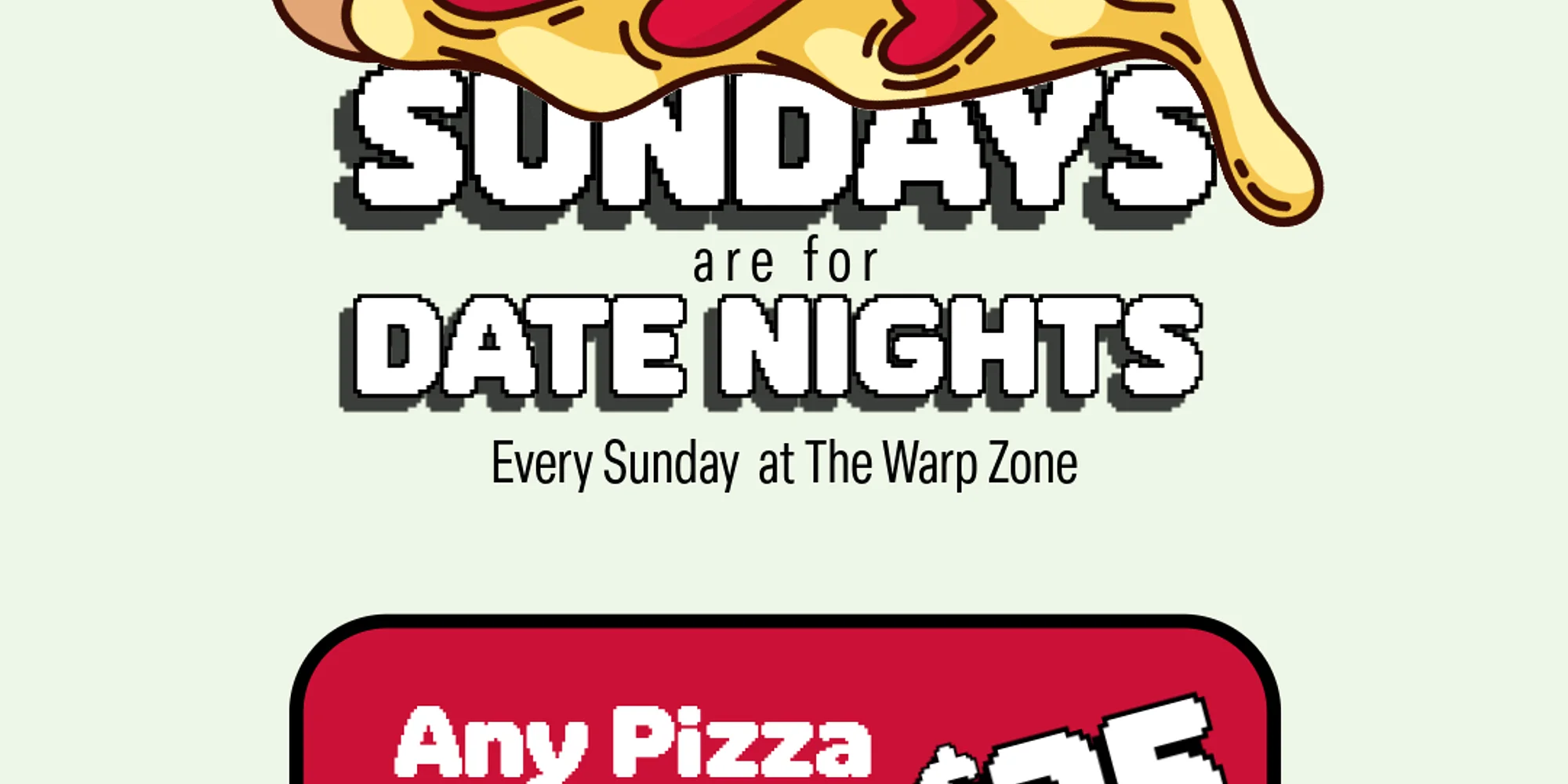 It's date night at The Warp Zone Get any pizza, 20 tokens and 2 drinks for $25 Choice of drinks are any beer, NA or signature cocktail.