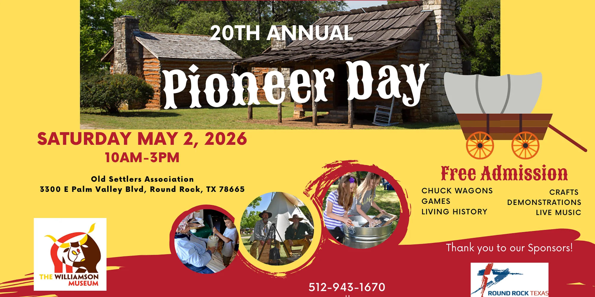 Join The Williamson Museum and Williamson County Old Settler’s Association for the 20th Annual Pioneer Day on Saturday, May 2nd from 10am to 3pm. This is a free event featuring Chuckwagons, games, living history, crafts, demonstrations, and live music. This event is held at Williamson County Old Settler’s Association located at 3300 E Palm Valley Blvd, Round Rock.