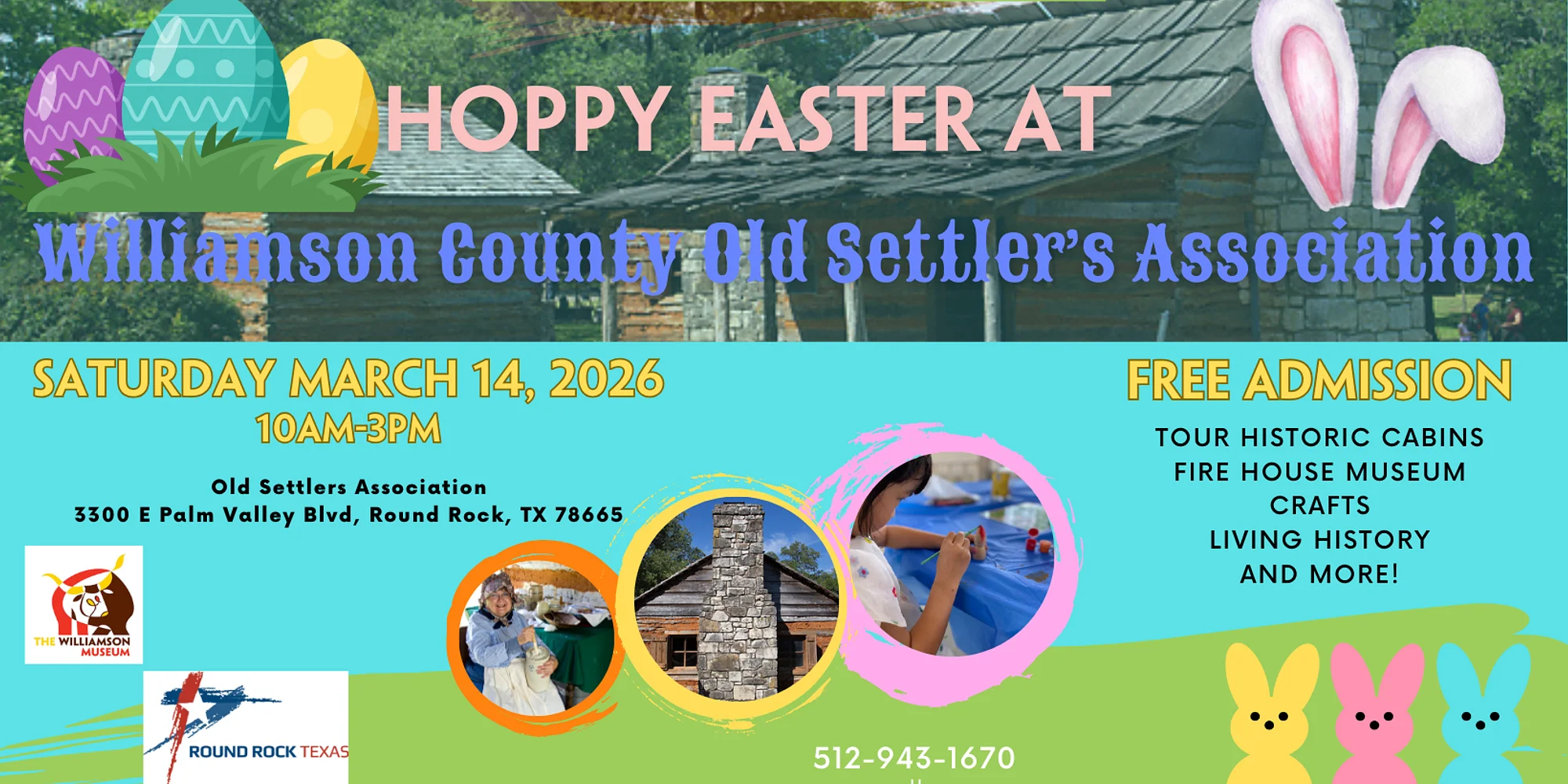 Hoppy Easter from The Williamson Museum! Explore the grounds and celebrate Easter at Williamson County Old Settlers Association in Round Rock on Saturday, March 14, from 10 am – 3 pm. Sponsored in part by the City of Round Rock, this event is free and open to the public. Old Settlers Association is located at 3300 E. Palm Valley Blvd. Across Harrell Parkway from The Salt Lick BBQ. Visitors will be able to participate in Easter crafts, churn butter, and wander through reenactment camps and the firehouse museum.