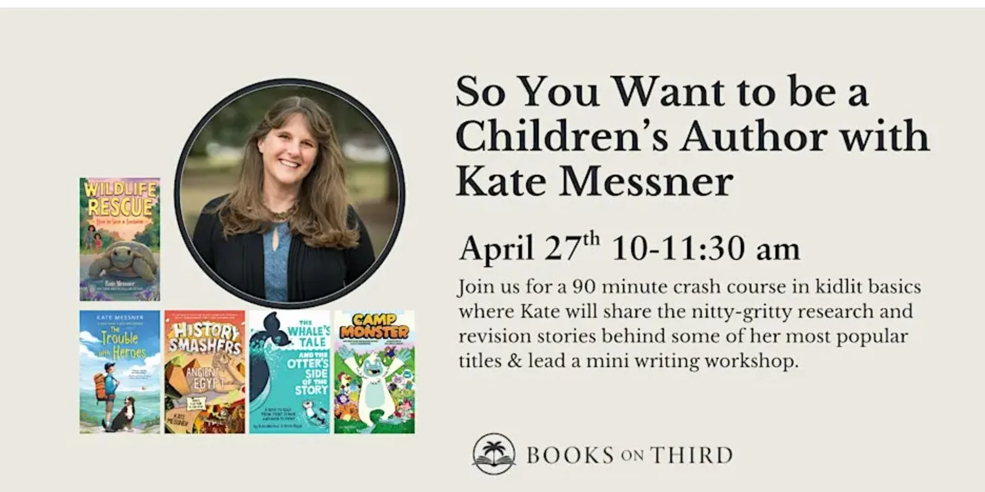 Join bestselling children’s author, Kate Messner, for a 90 minute crash course in kidlit basics. Have you ever dreamed of writing a book for young readers? Join New York Times bestselling author Kate Messner for an engaging and inspiring look behind the scenes of writing for children and young adults. From picture books to graphic novels, series fiction to nonfiction, Kate has done it all—writing more than seventy award-winning books published by Random House, Scholastic, Bloomsbury, Chronicle Books, HarperCollins, and more. In this interactive workshop-style event, Kate will: Share a crash course in kidlit basics Offer a peek into her research and revision process Lead a mini writing workshop using her favorite brainstorming strategy Answer your questions about writing, editing, and working with publishers Whether you’re just starting out or already working on a manuscript, this is a unique opportunity to learn from one of the most respected voices in children’s literature. Following the program, attendees will have the opportunity to purchase books and have them signed. Coffee and pastries are included with your ticket—come ready to learn, write, and be inspired. About the Author: New York Times bestselling author Kate Messner is passionately curious and writes books for kids who wonder, too. Her award-winning titles include beloved picture books like Over and Under the Wetland, Over and Under the Coral Reef, and The Whale’s Tale and the Otter’s Side of the Story, as well as novels like The Trouble with Heroes and All the Answers. She is also the author of graphic novels like Camp Monster, chapter book series including Ranger in Time and Wildlife Rescue, and the popular History Smashers graphic nonfiction series. A frequent speaker at conferences and schools around the world, Kate connects with readers through her passion for storytelling and curiosity-driven learning. Her books are often selected for community-wide reading programs, including One School, One Book initiatives. Before becoming a full-time writer, Kate worked as a TV news reporter and spent fifteen years teaching middle school English. She now splits her time between Lake Champlain and Southwest Florida. When she’s not writing, you’ll find her hiking, kayaking, birding, or enjoying bubble tea with her mom. Event Details: 📅 April 27th ⏰ 10-11:30 AM Reserve a Spot – Coffee and pastries included