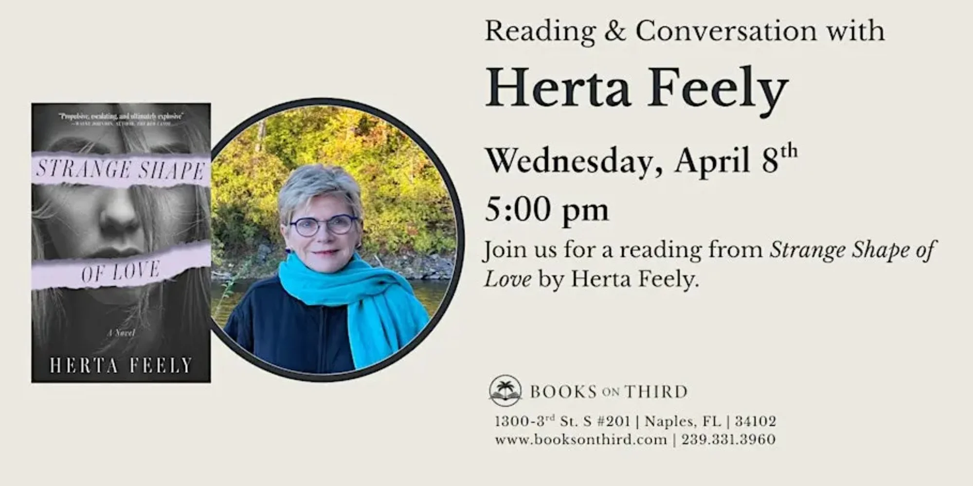 Join us for an evening with award winning author, Herta Feely as she reads from her latest book, The Strange Shape of Love Author Reading with Herta Feely — The Strange Shape of Love Wednesday, April 8, 2026 5:00 PM Free to Attend with RSVP Join us at Books on Third for a special author reading with award winning author Herta Feely, who will read from her newest novel, The Strange Shape of Love. In this compelling literary thriller, Feely explores the complexities of love, identity, and power in the digital age. Following the reading, guests will have the opportunity to ask questions and meet the author. This event is perfect for readers who enjoy suspenseful, thought-provoking fiction that examines how the past—and the internet—can shape our most intimate relationships. About the Book The Strange Shape of Love follows Charlotte Cooper, a thirty-year-old New York journalist who accepts an assignment in London—a city filled with memories she would rather forget. Just as Charlotte begins to rebuild both her career and her personal life, she reconnects with Rafe, the artist she once loved. But her fresh start quickly unravels when an anonymous envelope arrives containing explicit photos of Charlotte from years earlier. The message is chillingly clear: abandon her career, home, and lover—or face public humiliation. With only two weeks to uncover the truth, Charlotte must confront buried secrets, powerful men determined to control her story, and difficult truths that could cost her everything. About the Author Herta Feely is the award-winning author of Saving Phoebe Murrow (2016), a gripping debut published in both the United States and the United Kingdom that examines the dark undercurrents of social media and modern parenting. Her new novel, The Strange Shape of Love (2025), continues her exploration of how digital culture influences our most personal relationships. Her short stories and memoirs have appeared in The Sun, The Potomac Review, Big Muddy, and other literary journals and anthologies including Enhanced Gravity and She Can Find Her Way. Her essay “The Wall,” a reflection on immigration, received the American Independent Writer’s Award for Best Published Essay. Feely has also received fellowships from the James Jones Literary Society and the DC Commission on the Arts and Humanities. In addition to her fiction, she co-edited the anthology Confessions: Fact or Fiction?, which explores the blurred lines between memoir and imagination. Born in Yugoslavia, raised in Germany, and immigrating to the United States at age seven, Feely brings a global perspective and deep empathy to her storytelling. She currently lives in Washington, DC, with her husband.