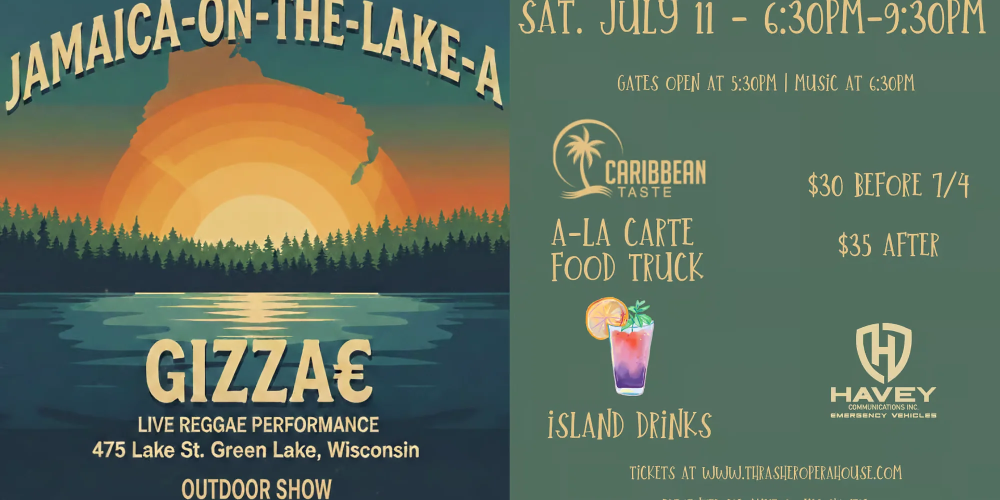The shores of Green Lake will transform into a tropical oasis for Jamaica-On-The-Lake-A, a vibrant community celebration held at the Havey Lot (475 Lake Street). This island-inspired evening will be headlined by the reggae powerhouse Gizzae, bringing their rhythms and soulful energy to the waterfront. Attendees can indulge in authentic flavors from the Caribbean Taste Food Truck, which will offer an ala carte menu of regional specialties complemented by a selection of refreshing island drinks. Proudly sponsored by Mike and Jill Havey and Havey Communications, the event serves a meaningful purpose beyond the music: 100% of ticket price will directly benefit the Thrasher Opera House Capital Campaign, supporting the historic venue’s ongoing efforts to enhance the local arts and culture scene. Because July is the perfect time to experience the crystal-clear waters and charming atmosphere of Wisconsin’s deepest inland lake, visitors are encouraged to book their stays now at one of the area’s local hotels or lakeside rentals to ensure they don’t miss out on this premier summer weekend. The only authorized source for online ticket sales is thrasheroperahouse.com – any other website, secondary or tertiary ticket agency, or ticket broker is not a verified ticketing agent. Tickets purchased from an unauthorized website may be counterfeit, stolen, or otherwise void and may not be valid for admission to the event. Please note: All ticket sales are final. No refunds or exchanges are allowed for ticket or service fees. Sponsored By: