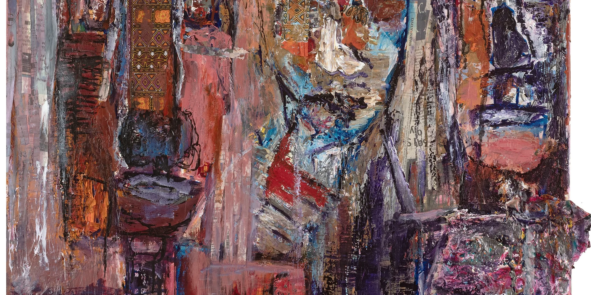 In The Mask I Wore, Makda Kibour presents a series of layered portraits that explore identity, memory, and self-inquiry. Working with acrylic, collage, African textiles, and stitched canvas, Kibour creates surfaces where faces emerge, fragment, and reassemble, suggesting identity as something fluid rather than fixed. Several works incorporate physical processes of cutting, stitching, scraping, and layering. In some paintings, the canvas itself is cut apart and sewn back together, allowing the surface to carry the marks of rupture and repair. These material gestures mirror the emotional and psychological themes explored throughout the exhibition. Moving between the personal and the collective, the paintings reflect how identity is shaped through ancestry, culture, and lived experience. Repeated figures and layered faces suggest the many selves that exist within a single life. The Mask I Wore reflects a journey through memory, survival, and self-examination—acknowledging the masks once worn to navigate the world while arriving at a place of greater honesty and self-awareness.