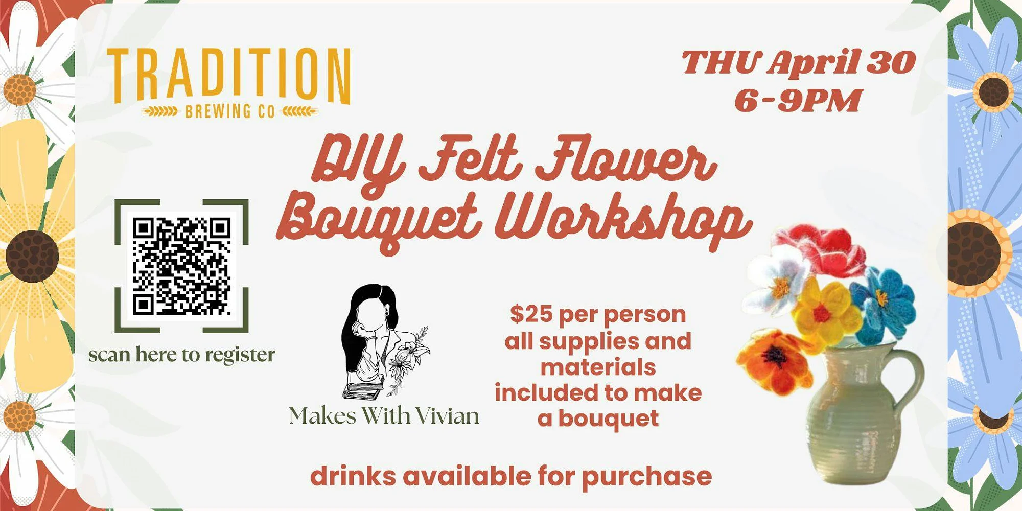 Make your own DIY Felt Flower Bouquets! Join us at Tradition Brewing Company on April 30, 2026 at 6-9 PM for a fun evening of crafts and craft beers! Attendees will learn how to create their own felt flower bouquets using felt, floral wire, and hot glue. Whether you’re new to textile crafts or an experienced crafter, this event is perfect for everyone! Ticket cost includes all materials for: a bouquet of five felt flowers. Come enjoy a relaxed atmosphere, great drinks, and meet new friends. All materials will be provided, so just bring yourself and your creativity! Don’t miss out on this opportunity to create a beautiful felt bouquet for yourself, or to gift one to a friend! Mark your calendars and we’ll see you there! Drinks will be available for purchase and step-by-step instructions will be provided. .
