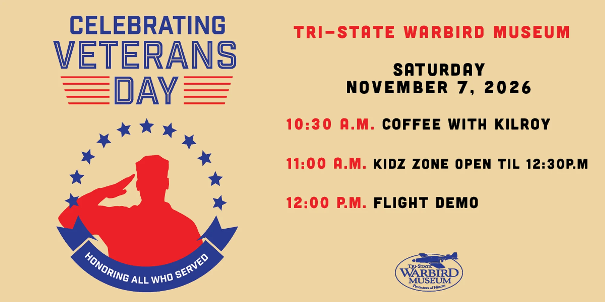 Join us as we celebrate Veterans! 10:30A Coffee with Kilroy Coffee and Donuts sponsored by Dunkin’ Donuts is free for Veterans! 11:00A – 12:30P Kidz Zone Open 12:00P Winners Announced for the Flight Demo 5 veterans will win a ride *weather depending* – Must be present to win. Rides are not transferable and you must be 18 & older to participate. Program and Event Cancellations & Refund Policy We regret that we cannot grant refunds for program and event registrations. If we must cancel a program or an event due to low enrollment, you will be given the option to move your registration to another program/event or receive a full refund. We reserve the right to cancel programs and events due to low enrollment or extreme weather. Registrants will be notified via email 24 hours prior if a program or event is cancelled.