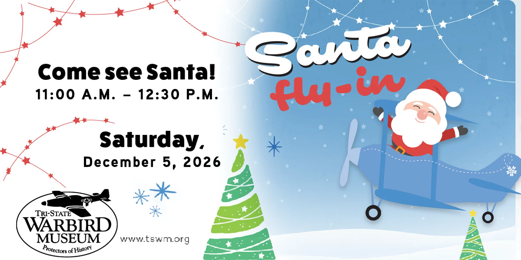 The Santa Fly-In is our most popular family event of the year! Santa will land at TSWM in a plane so come join us as we await Santa’s arrival! Once Santa arrives there will be hot drinks, cookies, crafts and fun activities! Santa will be available to meet children until 12:30P. Doors will open at 10:45A. Member Adult Ticket: $12 Member Children Ticket: $7 Non-Member Adult Ticket: $15 Non-Member Children Ticket: $10 Children 3 and under are FREE. Frequently Asked Questions Program and Event Cancellations & Refund Policy We regret that we cannot grant refunds for program and event registrations. If we must cancel a program or an event due to low enrollment, you will be given the option to move your registration to another program/event or receive a full refund. We reserve the right to cancel programs and events due to low enrollment or extreme weather. Registrants will be notified via email 24 hours prior if a program or event is cancelled.