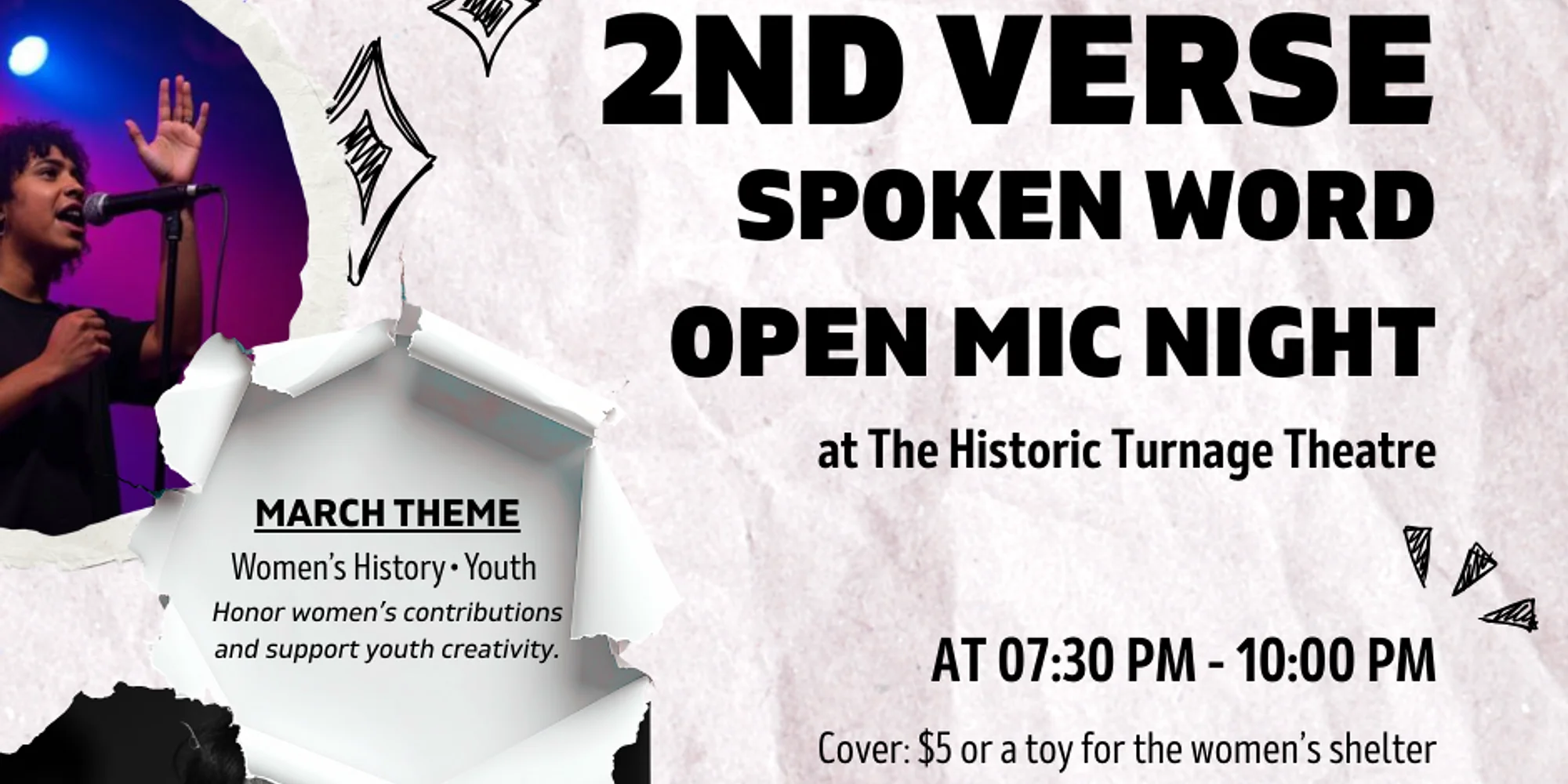 Get Your Tickets Here 2nd Verse Spoken Word Open Mic – March Edition Join us for a special backstage edition of 2nd Verse, our monthly spoken word open mic, as we celebrate Women’s History Month and Youth Art Month. This evening honors the voices, stories, and contributions of women while uplifting youth creativity through poetry, storytelling, and spoken word. Sign Up to Read Artists and audience members alike are invited to gather in an intimate setting that encourages connection, expression, and community support. Entry: $5 or a donation of a toy for a local women’s shelter Location: Backstage at the Historic Turnage Theatre
