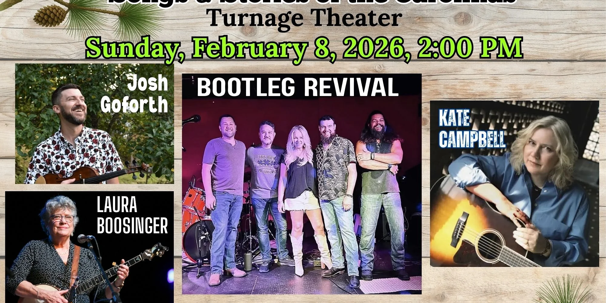 Get Your Tickets Here Celebrate the rich musical heritage of the Carolinas with Long Leaf Pine Variety: Songs & Stories of the Carolinas at the Turnage Theatre. This special afternoon brings together an incredible lineup of artists—Josh Goforth, Bootleg Revival, Laura Boosinger, and Kate Campbell—for a heartfelt blend of songs, storytelling, and traditions rooted in Southern culture. From toe-tapping tunes to poignant narratives, this variety show captures the spirit, history, and voices of the Carolinas in one unforgettable performance. Tickets are also available in Washington at Backwater Jack’s, Highwater Social, and the Turnage Theatre, and in Greenville at McFadyen Music.