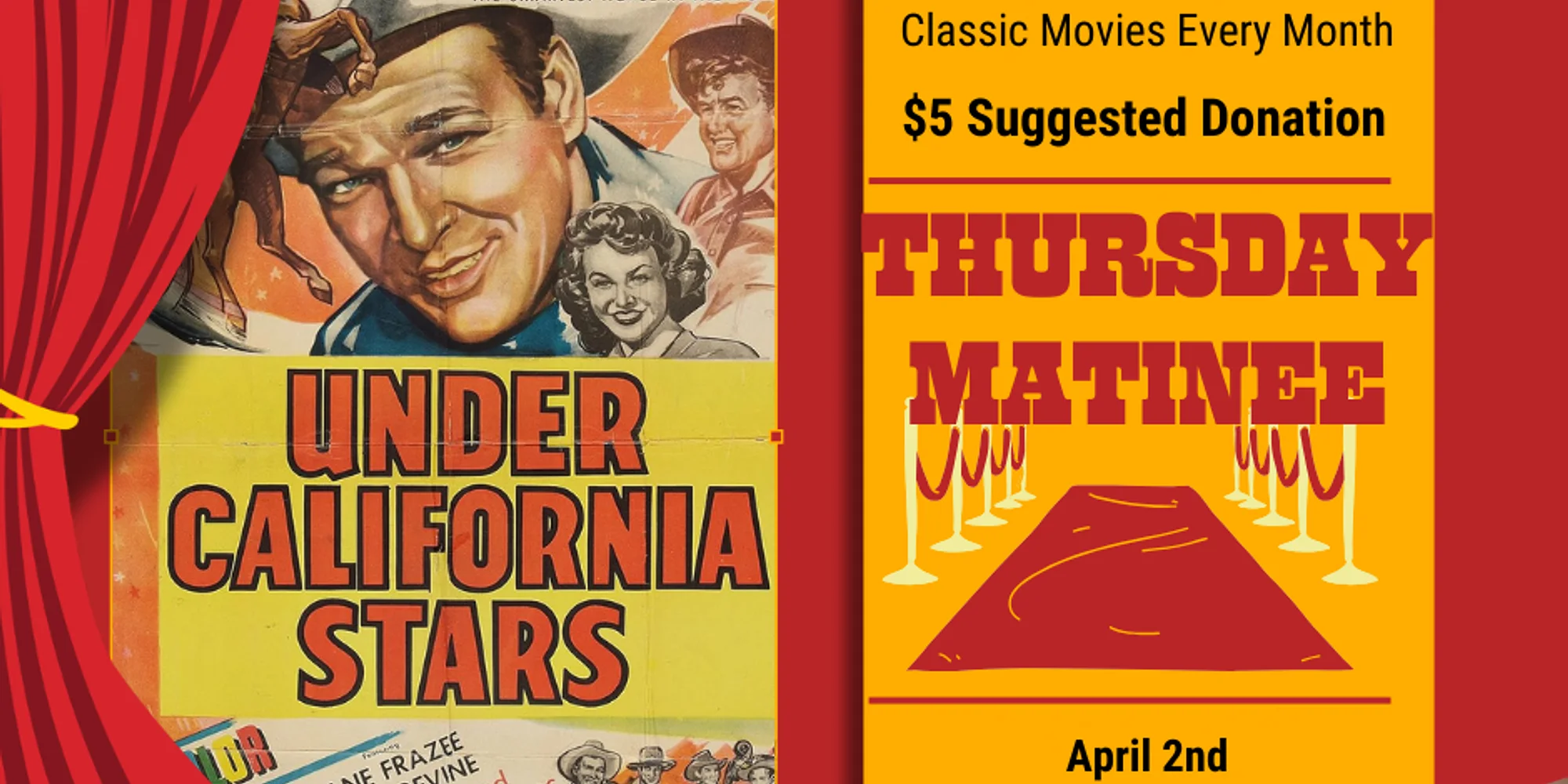 Saddle up for April’s Thursday Matinee Series featuring Under California Stars, a classic Roy Rogers western filled with adventure, music, and old-school Hollywood charm. Set against the wide-open landscapes of the American West, this film delivers wholesome entertainment, heroic hijinks, and plenty of vintage flair. Join us for a relaxing afternoon at the historic Turnage Theatre and enjoy a timeless matinee perfect for fans of classic westerns and Golden Age cinema. 🗓 Date: April 2 🕒 Time: 3:00–5:00 PM 💵 Suggested Donation: $5 No reservations required—just stop in, sit back, and enjoy a classic on the big screen.