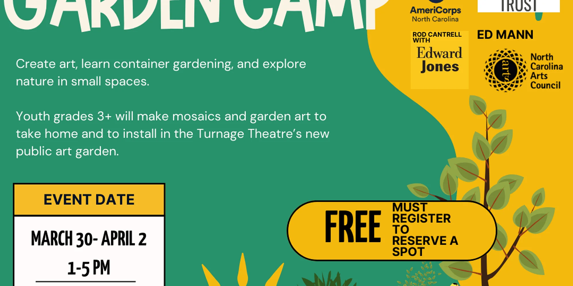 Register Here Youth Art & Garden Camp (Homeschool Week) Spring 2026 Youth Arts Camp Series Arts of the Pamlico, in partnership with the Pamlico Rose Institute’s Wellness AmeriCorps Team, is excited to offer a free Youth Art & Garden Camp designed especially for homeschool students while public schools are in session. This half-day camp invites youth to explore creative artmaking and hands-on gardening in small outdoor spaces. Campers will learn the basics of container gardening, including herbs, native plants, pollinators, and select vegetables, while also creating outdoor mosaics and garden art to take home—or help install in the Turnage Theatre’s new Public Art & Wellness Garden. 📅 March 30 – April 2, 2026 ⏰ 1:00–5:00 PM 👧🧒 Grades 3 and up 💲 Free (registration required) 🎨🌱 Art, gardening, and outdoor creativity 👥 Limited to 15 youth This camp is perfect for students interested in art, nature, and learning how creativity and wellness intersect in everyday spaces. Registration is required to reserve a spot. Space is limited. Thank you to our wonderful sponsors: PRI Wellness Corps, Pamlico Rose, Elite Trucking, AmeriCorps, Anonymous Trust, Rod Cantrell with Edward Jones, Ed Mann, and the North Carolina Arts Council.