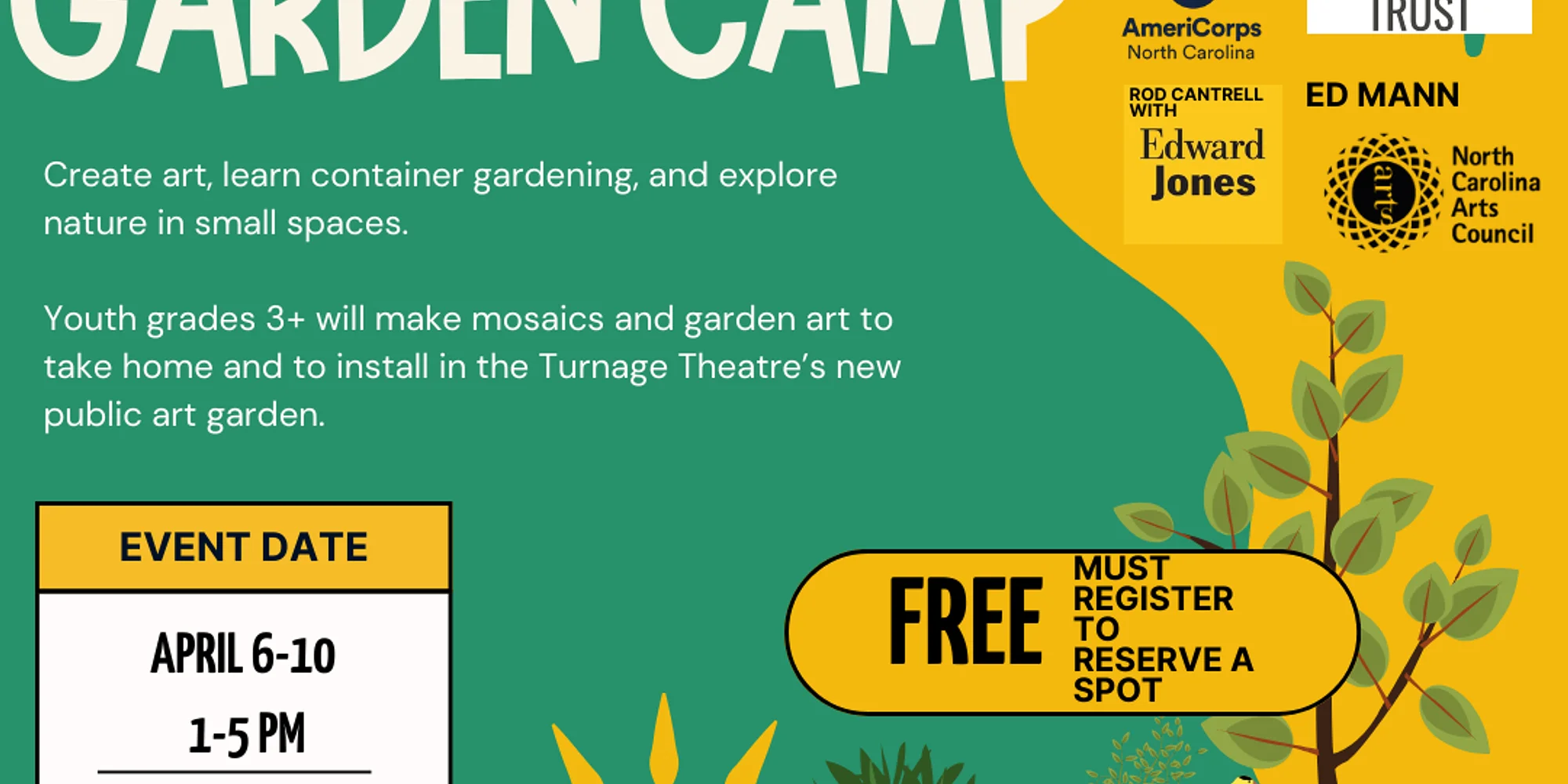 Register Here Youth Art & Garden Camp (BCS Spring Break Week) Spring 2026 Youth Arts Camp Series Arts of the Pamlico, in partnership with the Pamlico Rose Institute’s Wellness AmeriCorps Team, is excited to offer a free Youth Art & Garden Camp during Beaufort County’s Spring Break. This half-day camp invites youth to explore creative artmaking and hands-on gardening in small outdoor spaces. Campers will learn the basics of container gardening, including herbs, native plants, pollinators, and select vegetables, while also creating outdoor mosaics and garden art to take home—or help install in the Turnage Theatre’s new Public Art & Wellness Garden. 📅 April 6-10, 2026 ⏰ 1:00–5:00 PM 👧🧒 Grades 3 and up 💲 Free (registration required) 🎨🌱 Art, gardening, and outdoor creativity 👥 Limited to 15 youth This camp is perfect for students interested in art, nature, and learning how creativity and wellness intersect in everyday spaces. Registration is required to reserve a spot. Space is limited. Thank you to our wonderful sponsors: PRI Wellness Corps, Pamlico Rose, Elite Trucking, AmeriCorps, Anonymous Trust, Rod Cantrell with Edward Jones, Ed Mann, and the North Carolina Arts Council.