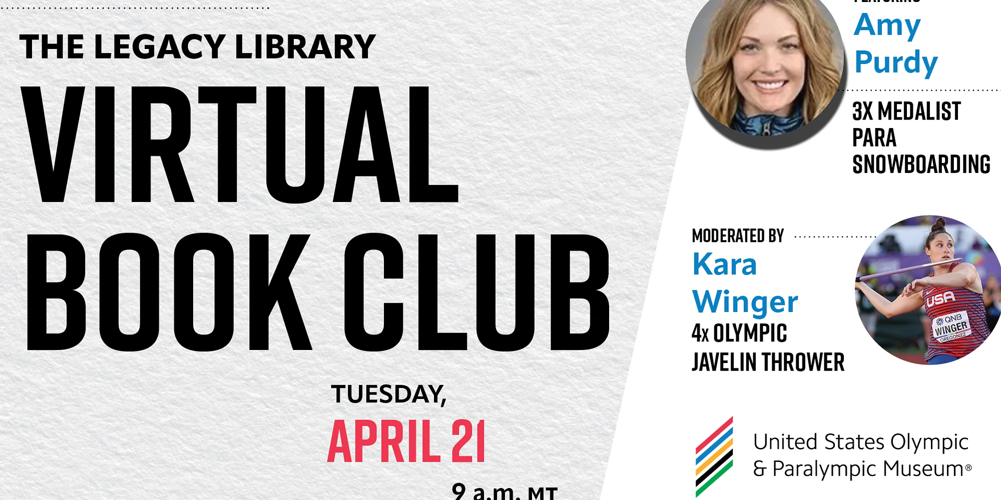 Join us for a candid conversation with Amy Purdy, 3x medalist in Para snowboarding, as she reflects on the experiences behind her latest book, Bounce Forward: 21 Tools to Live a Life Beyond Limits. Kara Winger, 4x Olympic javelin thrower, will moderate the conversation. This is a rare chance to go beyond the podium — to connect with an athlete who has turned adversity into action and competition into purpose. Reserve your spot today. It’s free.