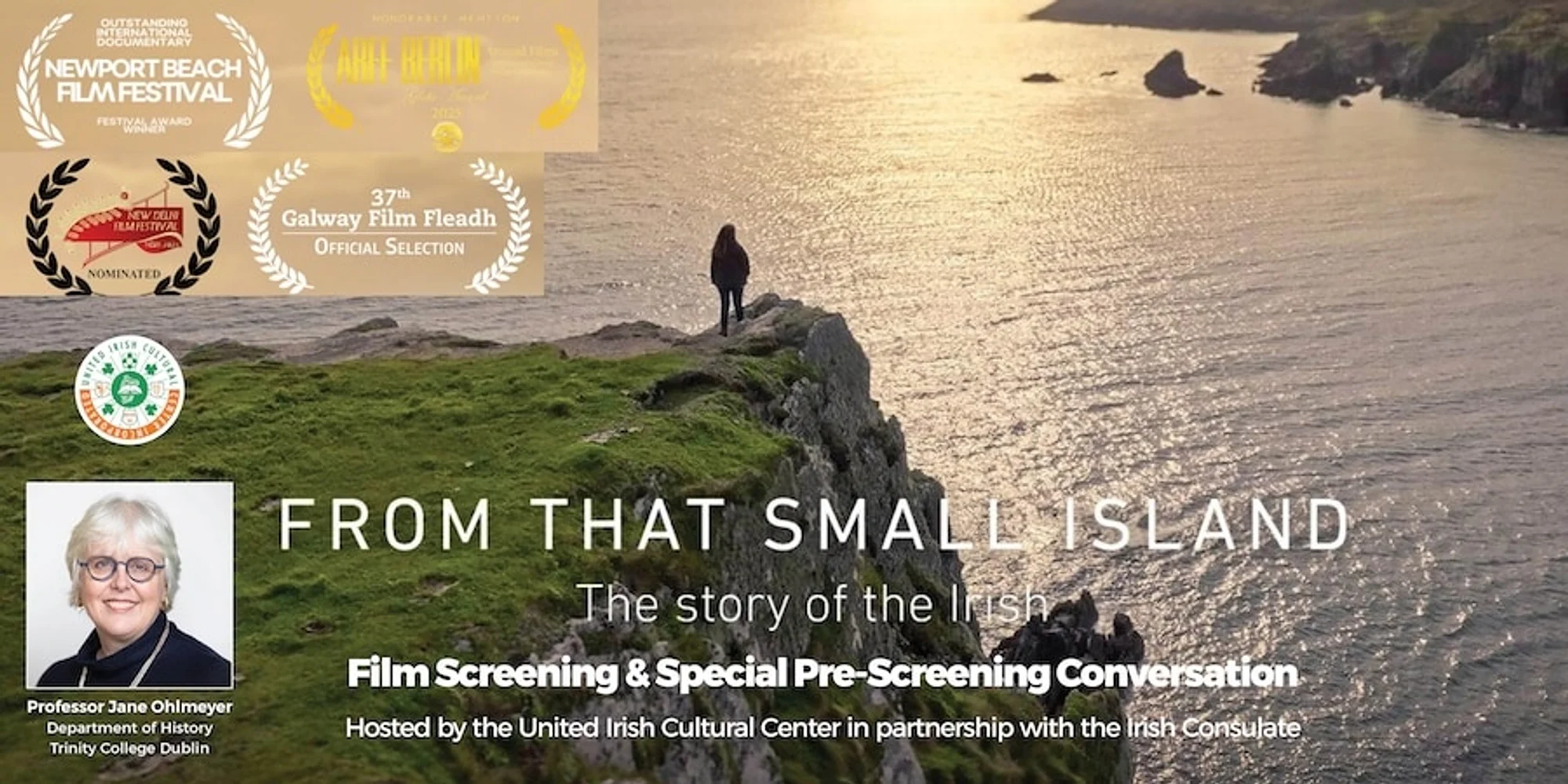 Sunday, April 26, 2026 TICKETS Hosted by the United Irish Cultural Center in partnership with the Irish Consulate Join us for an exceptional evening of history, conversation, and film as the United Irish Cultural Center and the Irish Consulate welcome Dr. Jane Ohlmeyer, Erasmus Smith’s Professor of Modern History at Trinity College Dublin, as a special guest. Before the screening, Dr. Ohlmeyer will take part in an exclusive pre-screening conversation exploring the deep historical themes, global connections, and enduring legacy of the Irish people—providing rich context for the film that follows. This intimate discussion offers audiences a rare opportunity to engage with one of Ireland’s leading historians and gain fresh insight into the story behind the story. Evening Program • 6:00 pm – Doors Open • 6:15 pm – Pre-Screening Conversation with Dr. Jane Ohlmeyer • 7:00 pm – Film Screening begins ⸻ About the Film From That Small Island (2025) is a sweeping historical documentary written and produced by Bríona Nic Dhiarmada and narrated by Colin Farrell. Spanning from Ireland’s earliest inhabitants to a modern global diaspora of over 80 million people, the film blends rich storytelling, immersive visuals, and the latest scientific discoveries to paint an epic portrait of a people whose influence reaches far beyond their island shores. Shot on location across 17 countries, the documentary is both intimate and expansive—grounded in history while resonating powerfully today. Produced by the award-winning team behind 1916: The Irish Rebellion, and featuring an original score by Colm Mac Con Iomaire, From That Small Island is a must-see cinematic journey for anyone interested in Irish history, identity, and global impact. Genre: History Documentary Country of Origin: Ireland Year: 2025 Duration: 99 minutes Age Recommendation: G (general) Directors: Rachael Moriarty & Peter Murphy Writer & Producer: Briona Nic Dhiarmada Narrator: Colin Farrell More information