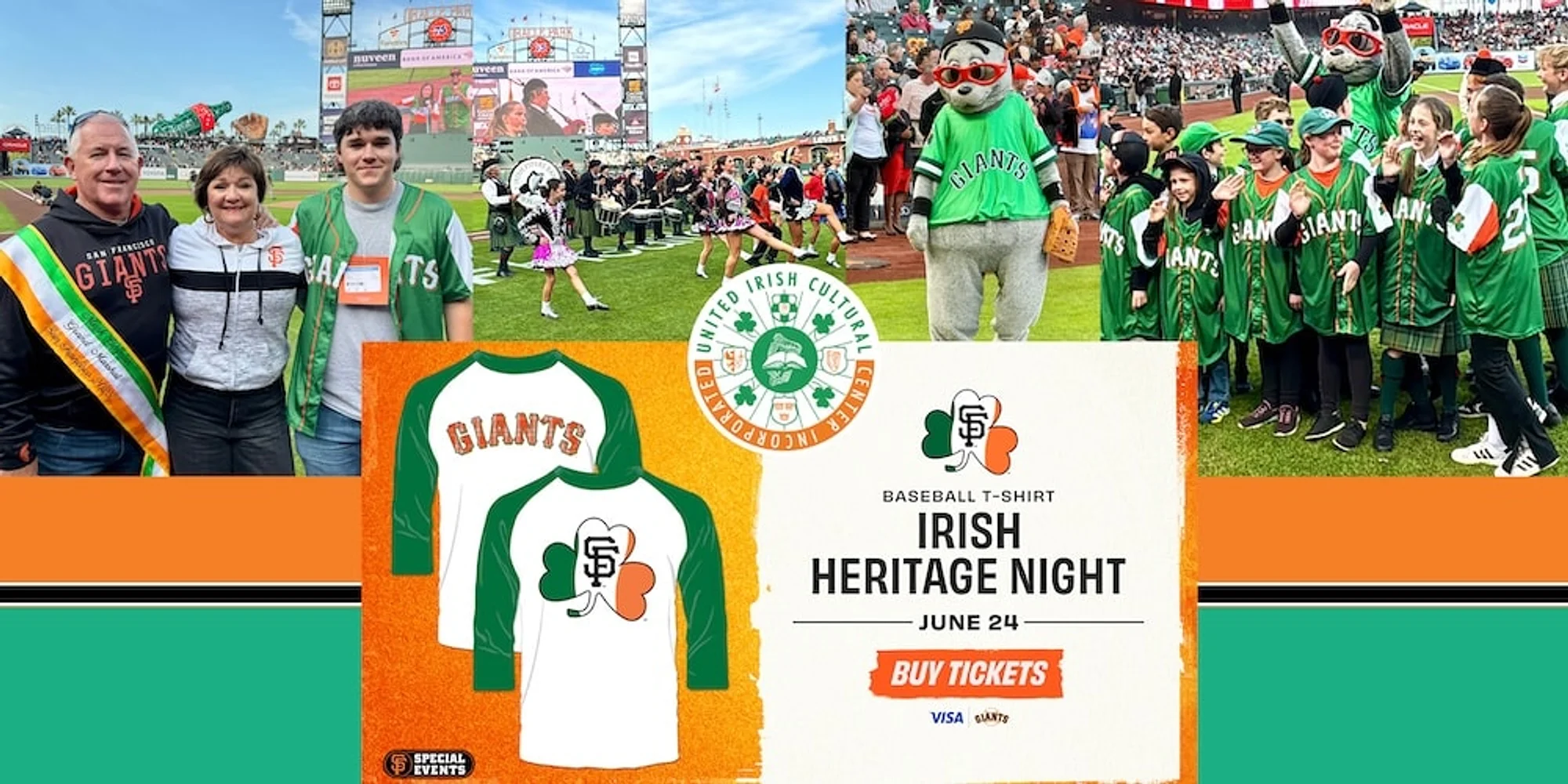 Irish Heritage Night with the San Francisco Giants Wednesday, June 24, 2026 6:45 pm SF Giants vs the A’s TICKETS Join the UICC and bring the luck o’ the Irish to Oracle Park on Wednesday, June 24, 2026, for Irish Heritage Night as the SF Giants take on the A’s. Get in gear with the special jersey tee giveaway included with your Irish Heritage Night special Ticket. Stay tuned for updates on pre-and in-game entertainment and activations featuring members of our community. Proceeds from ticket sales benefit the UICC and other local Irish organizations. Thanks to the SF Giants organization for supporting Irish heritage and being wonderful community partners.