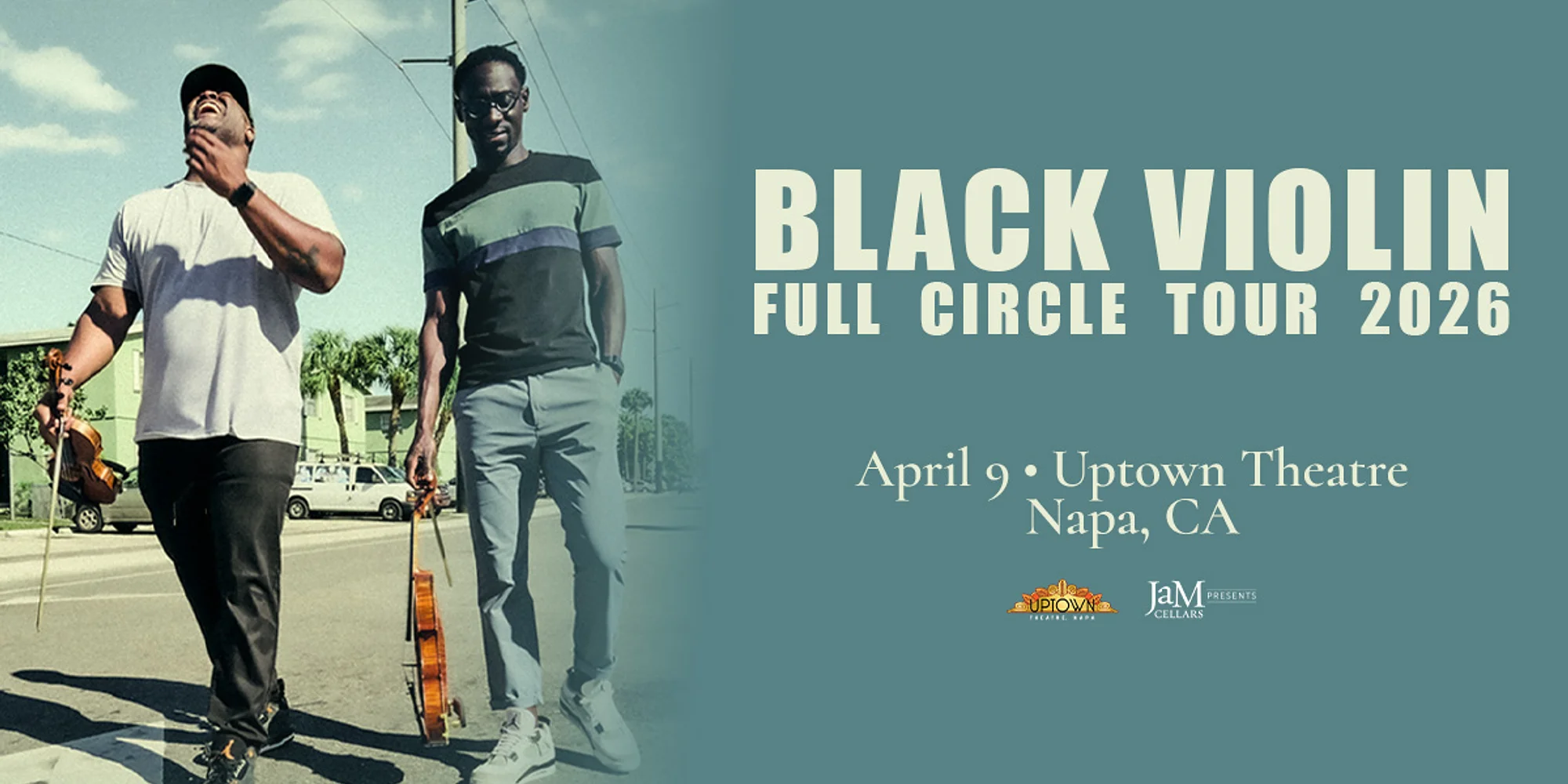 April 9, 2026 PURCHASE TICKETS HERE Doors 7pm/ Show 8pm Ages: 12+ $1 charity lift on each ticket, proceeds to go to the Black Violin Foundation Step into Black Violin’s Full Circle Tour, where GRAMMY-nominated duo Wil Baptiste and Kev Marcus redefine the possibilities of music by merging classical depth with hip-hop’s pulse. This tour captures the essence of returning to where it all began—transformed and reimagined. Each powerful performance invites audiences to reflect on their own journeys, discovering that even as we evolve, we’re often drawn back to our roots with renewed purpose. From high school orchestra classmates to groundbreaking artists, Black Violin’s path reflects resilience, creativity, and the courage to challenge expectations. With their Black Violin Foundation reaching over 100,000 students each year, they’re building a legacy that transcends the stage, inspiring a new generation to dream boldly. Join them for an unforgettable night that celebrates growth, music, and the beauty of coming full circle. Follow Black Violin: Instagram – https://www.instagram.com/blackviolin/ Facebook – https://www.facebook.com/BlackViolinMusic/ Tik Tok – https://www.tiktok.com/@blackviolinmusic Spotify – https://open.spotify.com/artist/4zeHJ3kiJyjYXlIOcG4MA7?si=fFz584TKS3mBl2mWLXktBQ Website – http://blackviolin.net