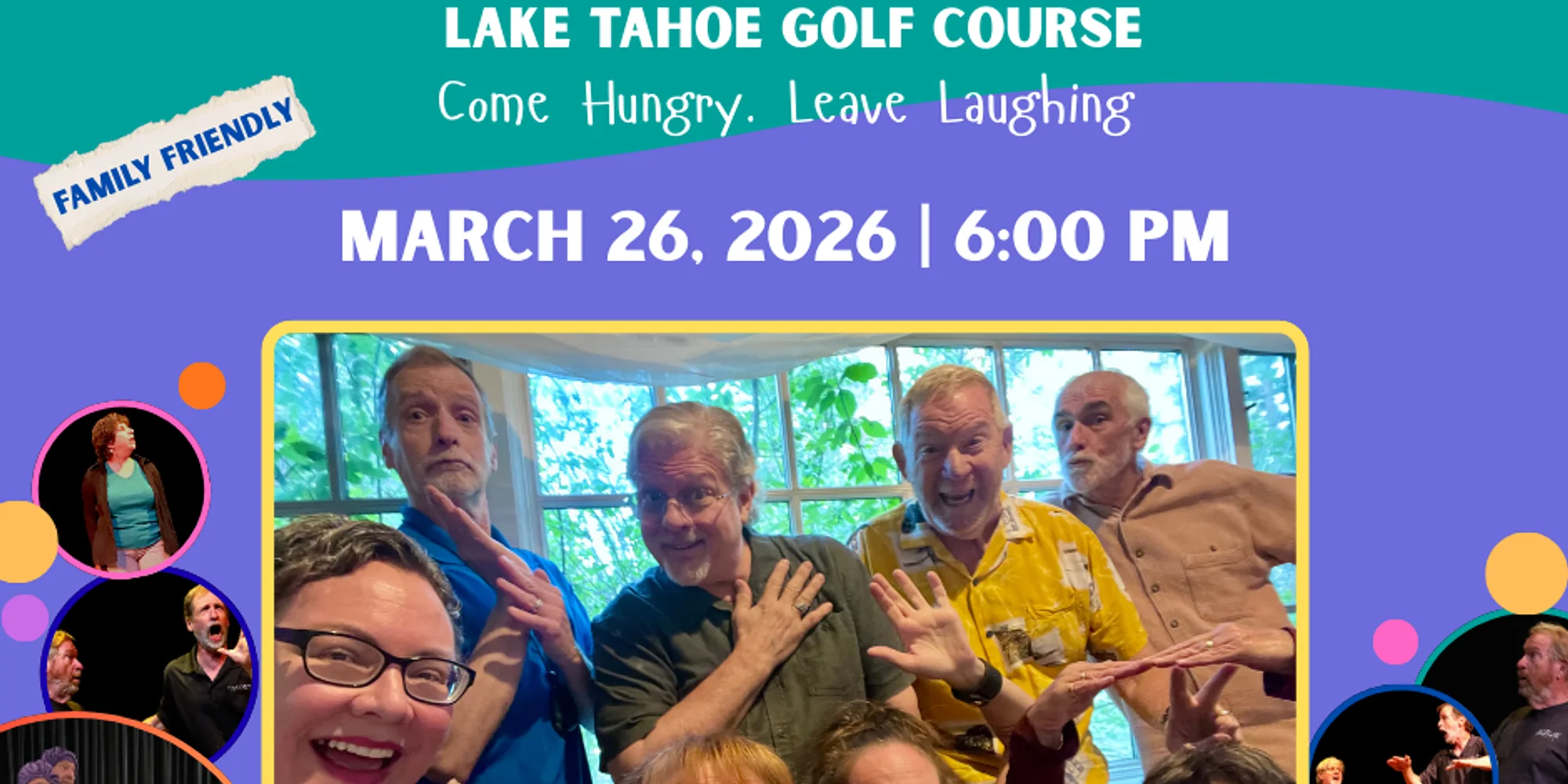 Valhalla Tahoe Presents ANOTHER DINNER & IMPROV AT LAKE TAHOE GOLF COURSE Come hungry. Leave laughing. What happens when you have a fun night of improv with dinner that sells out? Why, you schedule another one! A night where you will laugh all the way home. We did one in January and you came, so why not do it again? Valhalla Tahoe brings the Tahoe Improv Players back for yet another winter show on March 26th, delivering fast-paced, totally unscripted comedy in the style of “Whose Line Is It Anyway?” And, keeping it fresh, for those who have seen us, we promise some new games that you haven’t seen, all while using your ideas (choose wisely). This legendary local troupe has been cracking up Tahoe since 1993, making them the longest-running comedy show in town. The show is smart, silly, and family-friendly, so yes—bring the kids… and your sense of humor. Dinner First, Comedy Second Enjoy a buffet dinner of Chicken Fajitas with rice & beans before the show. This time the price also includes dessert and coffee at intermission! Full bar available as well as nonalcoholic drinks. Doors open & Buffet: 6:00 PM Show starts: 7:00 PM Dessert & coffee during intermission at 8:00 PM Show ends: 9:00 PM Tickets $39 Dinner + Show $30 Kids 12 & under Lake Tahoe Golf Course 2500 Emerald Bay Rd, South Lake Tahoe Bring the kids. Bring your friends. Bring your weirdest ideas. It’s Tahoe’s best value in live entertainment. Seating is limited—grab tickets before someone else steals your seat and your great suggestion.