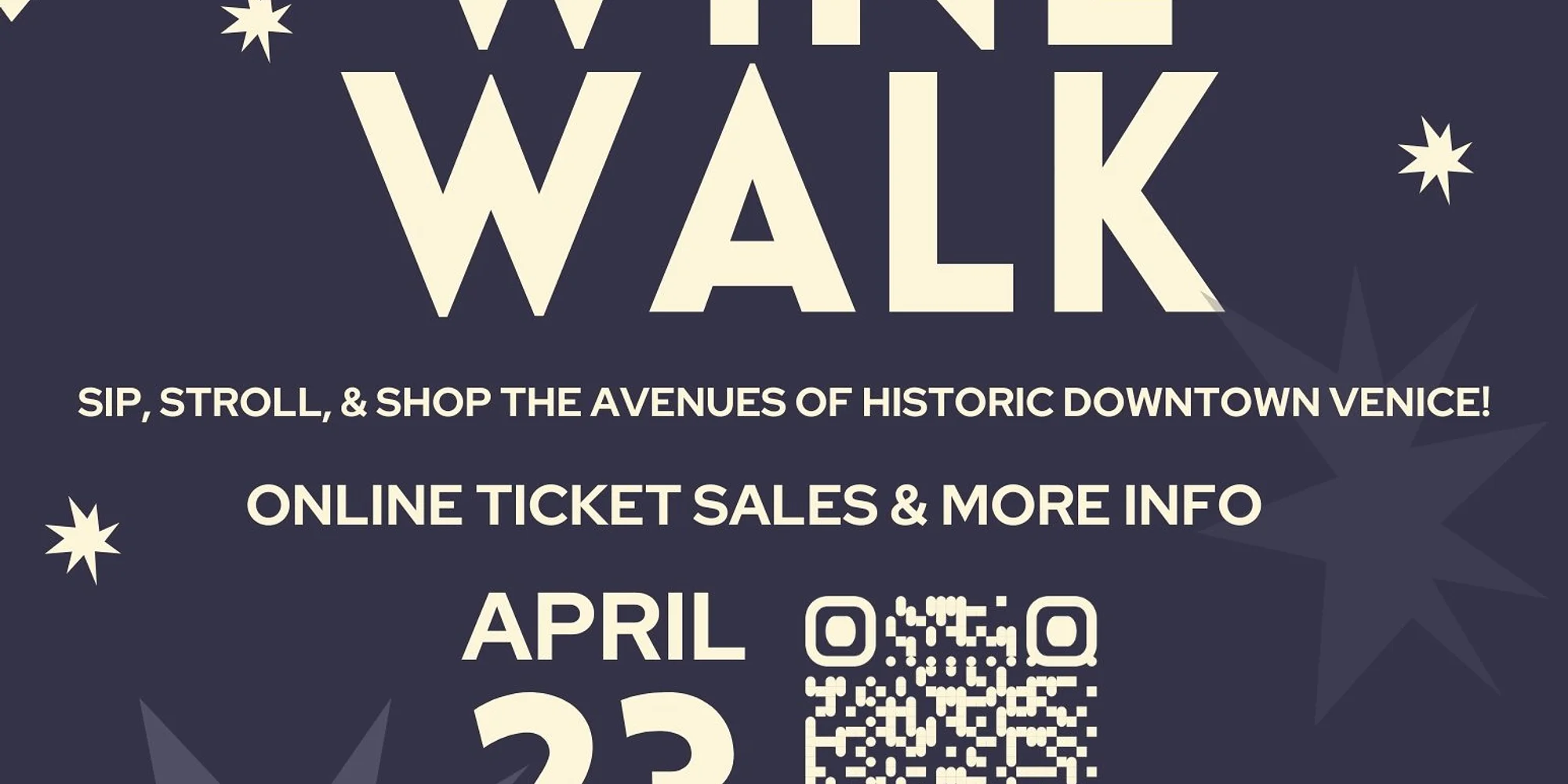 The ultimate sip and shop! Join us downtown for the spring Wine Walk. Tickets $10 per person, age 21 and over only. All proceeds benefit Venice MainStreet, your local community-based economic development organization. In-Person Ticket Purchase Option: LIMITED TICKET SALES ON DAY-OF EVENT due to high demand! – Starting at 4:00pm on the day of the event (4/23/26), go to the Information Kiosk in Centennial Park (200 W. Venice Ave., Venice, FL 34285) to purchase a wristband ticket. – Cash or credit card will be accepted. – Must be 21 years or older to participate in this event and please be prepared to show a valid ID to purchase a wristband ticket. Online Tickets: CLICK HERE FOR TICKET LINK – PRE-SALES: will start on Thursday, March 26 – PICK-UP: Starting at 4:00pm on the day of the event (Thursday, 4/23/26), go to the Information Kiosk in Centennial Park (200 W. Venice Ave., Venice, FL 34285) to receive your pre-purchased wristband ticket. Your purchase and age will be verified by showing your valid ID. – Must be 21 years or older to participate in this event and please be prepared to show a valid ID to obtain your pre-purchased wristband ticket. Wristband tickets are for sampling 1 ounce wine pours; wine specials may also be available for purchase at some participating restaurant locations. PARTICIPATING VENICE MAINSTREET PARTNER LOCATIONS: Wristband tickets are required to sample wine. *PLEASE NOTE: Dining/Beverage locations may be offering drink specials, or other, for purchase. Bodrum Restaurant* (drink special for purchase plus samples) Burgundy Square By The Sea Esthetics Cafe Venice Restaurant & Bar* (drink special for purchase) Curated Art by JB Dewitt Collectors Gallery & Framery Daiquiri Deck* (drink special for purchase plus samples) Dana Tyler Edward Jones, Robert Domke (water/hydration stop) Gulf Shores Realty Island Gift Nook Island Life Hammock Co. Local Tides Venice Lost Girl Prairie Krystyna’s Made In Italy* (drink special for purchase) Patchington Premier Sotheby’s International Realty Sea Bags Seaside Chic Boutique Seed and Bean Market* (drink special for purchase plus samples) Shirt Stop Sunbug Tri-Healthy Twist The Island Bookshop Venice Estate Gallery Venice Locale Venice Wine and Coffee Company* (drink special for purchase)