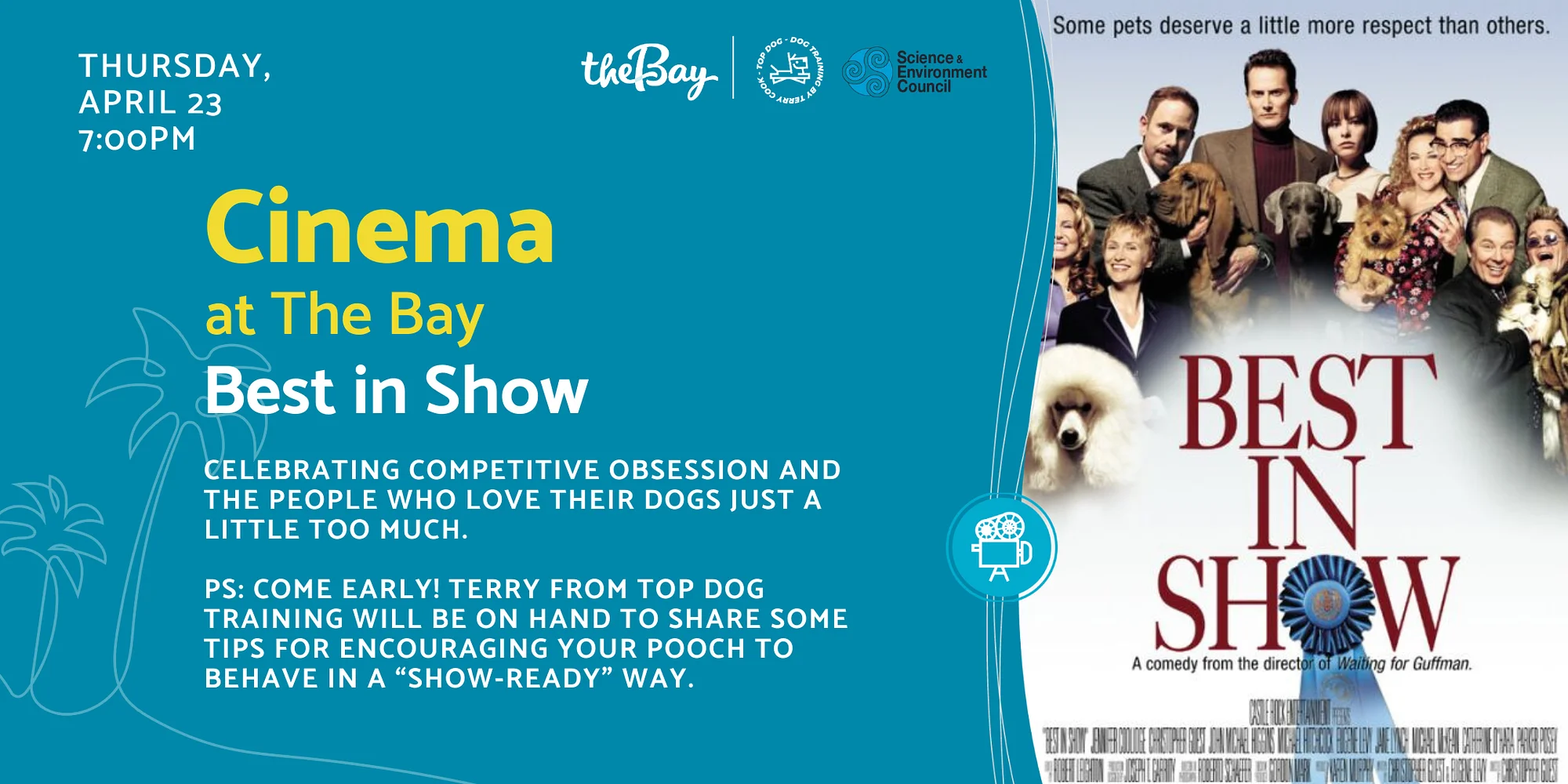 Cinema at The Bay: Best in Show Thursday, April 23 CLICK HERE TO REGISTER Enjoy a free outdoor movie under the stars at The Bay! Celebrating competitive obsession and the people who love their dogs just a little too much.PS: Come early! Terry from Top Dog Training will be on hand to share some tips for encouraging your pooch to behave in a “show-ready” way. (PG-13) – A behind-the-scenes look into the highly competitive and cut-throat world of dog shows through the eyes of a group of ruthless dog owners. Come hungry and thirsty! The Nest Café will be serving delicious food, fresh popcorn and refreshing drinks. Bring your blankets, chairs, and friends to add even more comfort and fun. Cinema at The Bay is presented by The Desenberg Foundation. Know Before You Go: The Bay park address is 1055 Blvd of the Arts, Sarasota FL 34236 Free parking is located around the site and all parking lots remain open — along Blvd of the Arts and in front of the Van Wezel, Municipal Auditorium and Blue Pagoda. Please avoid parking in designated Sarasota Orchestra parking areas. Construction of the new Town Square (located between the Municipal Auditorium and Art Center) is underway and affects pedestrian routes between the parking lot along N. Tamiami Trail and venues west of Van Wezel Way (incl. The Bay park, Van Wezel, and Holley Hall). Signs are posted to direct you between these locations. Please allow extra time to walk from and to your vehicle. Click here to view recommended pedestrian routes. Click here to learn more about Phase 2 of The Bay. Some events attract large crowds: Arrive early, be kind, and please be patient. All pets must be non-aggressive and on a leash at all times. Owners are expected to pick up after their pets. Please report any risky or unsafe behavior to the Sarasota Non-Emergency Police 24 hours a day (941) 316-1199. NOTE: In the event of inclement weather, this event will be CANCELLED. Notices will be communicated via The Bay website calendar, Eventbrite, Facebook and Instagram up to one hour before start time as unpredictable Florida weather changes quickly.