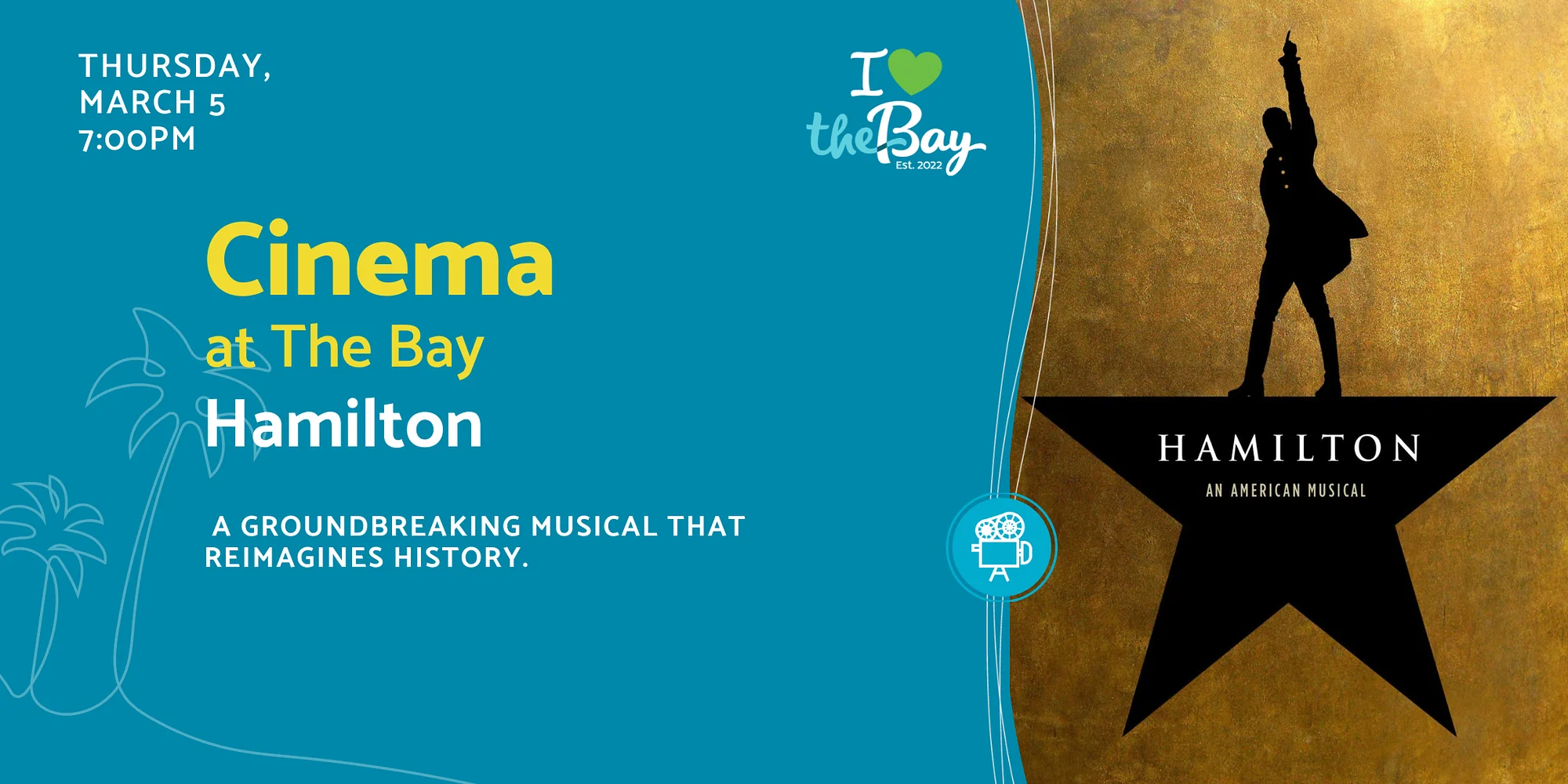 Cinema at The Bay: Hamilton Thursday, March 5 CLICK HERE TO REGISTER Enjoy a groundbreaking musical that reimagines history. (PG-13) – The real life of one of America’s foremost founding fathers and first Secretary of the Treasury, Alexander Hamilton. Captured live on Broadway from the Richard Rodgers Theater with the original Broadway cast. Come hungry and thirsty! The Nest Café will be serving delicious food, fresh popcorn and refreshing drinks. Bring your blankets, chairs, and friends to add even more comfort and fun. Cinema at The Bay is presented by The Desenberg Foundation. Know Before You Go: The Bay park address is 1055 Blvd of the Arts, Sarasota FL 34236 Free parking is located around the site and all parking lots remain open — along Blvd of the Arts and in front of the Van Wezel, Municipal Auditorium and Blue Pagoda. Please avoid parking in designated Sarasota Orchestra parking areas. Construction of the new Town Square (located between the Municipal Auditorium and Art Center) is underway and affects pedestrian routes between the parking lot along N. Tamiami Trail and venues west of Van Wezel Way (incl. The Bay park, Van Wezel, and Holley Hall). Signs are posted to direct you between these locations. Please allow extra time to walk from and to your vehicle. Click here to view recommended pedestrian routes. Click here to learn more about Phase 2 of The Bay. Some events attract large crowds: Arrive early, be kind, and please be patient. All pets must be non-aggressive and on a leash at all times. Owners are expected to pick up after their pets. Please report any risky or unsafe behavior to the Sarasota Non-Emergency Police 24 hours a day (941) 316-1199. NOTE: In the event of inclement weather, this event will be CANCELLED. Notices will be communicated via The Bay website calendar, Eventbrite, Facebook and Instagram up to one hour before start time as unpredictable Florida weather changes quickly.