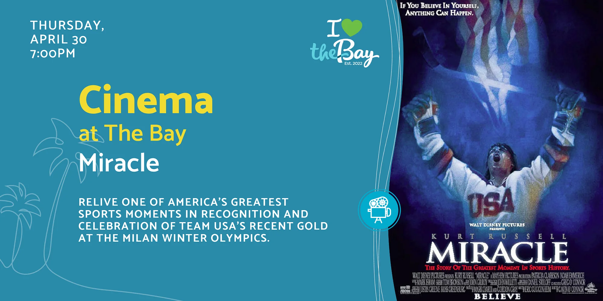 Cinema at The Bay: Miracle Thursday, April 30 CLICK HERE TO REGISTER Enjoy a free outdoor movie under the stars at The Bay! Relive one of America’s greatest sports moments in recognition and celebration of Team USA’s recent gold at the MIlan Winter Olympics. (PG) – The true story of Herb Brooks, the player-turned-coach who led the 1980 U.S. Olympic hockey team to victory over the seemingly invincible Soviet squad. Come hungry and thirsty! The Nest Café will be serving delicious food, fresh popcorn and refreshing drinks. Bring your blankets, chairs, and friends to add even more comfort and fun. Cinema at The Bay is presented by The Desenberg Foundation. Know Before You Go: The Bay park address is 1055 Blvd of the Arts, Sarasota FL 34236 Free parking is located around the site and all parking lots remain open — along Blvd of the Arts and in front of the Van Wezel, Municipal Auditorium and Blue Pagoda. Please avoid parking in designated Sarasota Orchestra parking areas. Construction of the new Town Square (located between the Municipal Auditorium and Art Center) is underway and affects pedestrian routes between the parking lot along N. Tamiami Trail and venues west of Van Wezel Way (incl. The Bay park, Van Wezel, and Holley Hall). Signs are posted to direct you between these locations. Please allow extra time to walk from and to your vehicle. Click here to view recommended pedestrian routes. Click here to learn more about Phase 2 of The Bay. Some events attract large crowds: Arrive early, be kind, and please be patient. All pets must be non-aggressive and on a leash at all times. Owners are expected to pick up after their pets. Please report any risky or unsafe behavior to the Sarasota Non-Emergency Police 24 hours a day (941) 316-1199. NOTE: In the event of inclement weather, this event will be CANCELLED. Notices will be communicated via The Bay website calendar, Eventbrite, Facebook and Instagram up to one hour before start time as unpredictable Florida weather changes quickly.