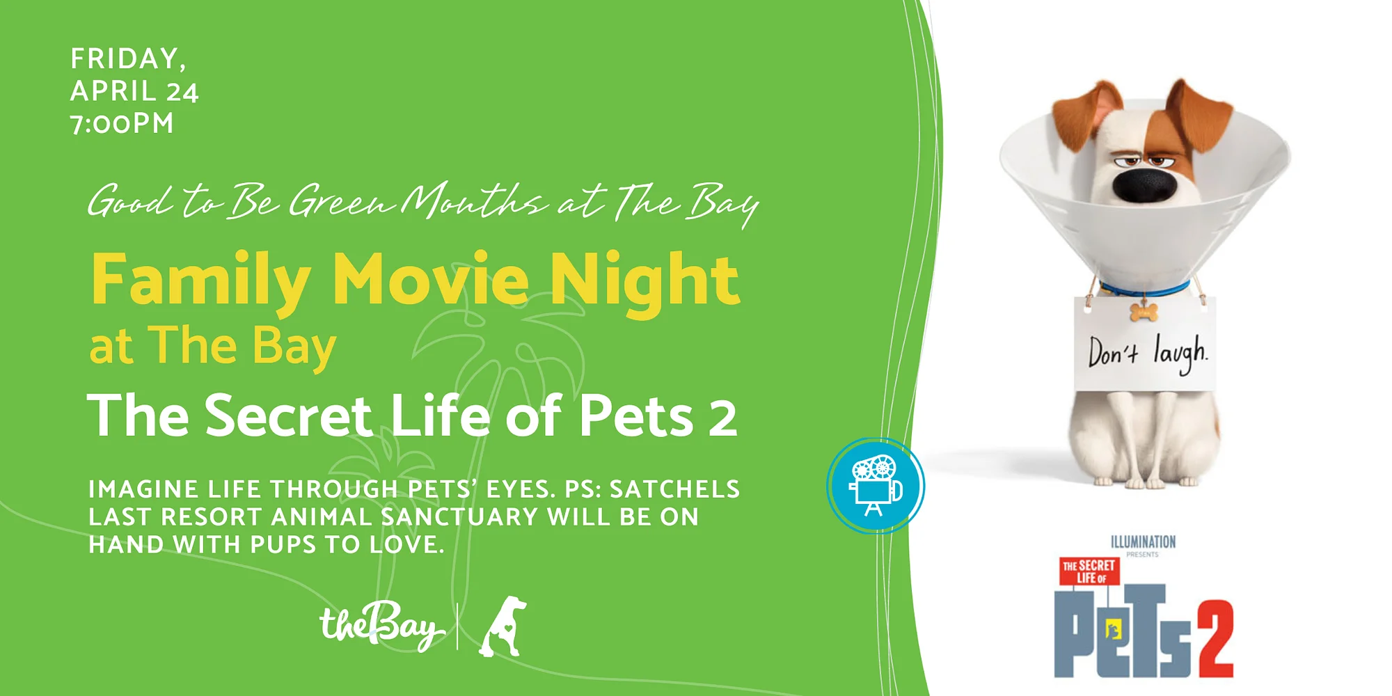 Family Movie Night at The Bay: The Secret Life of Pets 2 Friday, April 24 CLICK HERE TO REGISTER Celebrate Good to Be Green Months (March & April) at The Bay Enjoy a free outdoor movie under the stars at The Bay! Imagine life through pets’ eyes. (PG) – Continuing the story of Max and his pet friends, following their secret lives after their owners leave them for work or school each day. Come early to enjoy these puppy-licious fun offerings: Mix and mingle with the folks from Satchel’s Last Resort who will be on hand with pups who need love and a home. Laugh with the Poop Fairy and become a champion in the Poop Toss Game! Science and Environmental Council in partnership with Sarasota County Stormwater will be on hand to educate pet owners on the importance of pet waste disposal to protect local waterways from harmful bacteria and nutrients. Come hungry and thirsty! The Nest Café will be serving delicious food, fresh popcorn and refreshing drinks. Bring your blankets, chairs, and friends to add even more comfort and fun. Cinema at The Bay is presented by The Desenberg Foundation. Know Before You Go: The Bay park address is 1055 Blvd of the Arts, Sarasota 34236 Free parking is located around the site and all parking lots remain open — along Blvd of the Arts and in front of the Van Wezel, Municipal Auditorium and Blue Pagoda. Please avoid parking in designated Sarasota Orchestra parking areas. Construction of the new Town Square (located between the Municipal Auditorium and Art Center) is underway and affects pedestrian routes between the parking lot along N. Tamiami Trail and venues west of Van Wezel Way (incl. The Bay park, Van Wezel, and Holley Hall). Signs are posted to direct you between these locations. Please allow extra time to walk from and to your vehicle. Click here to view recommended pedestrian routes. Click here to learn more about Phase 2 of The Bay. Some events attract large crowds: Arrive early, be kind, and please be patient. All pets must be non-aggressive and on a leash at all times. Owners are expected to pick up after their pets. Please report any risky or unsafe behavior to the Sarasota Non-Emergency Police 24 hours a day (941) 316-1199. NOTE: In the event of inclement weather, this event will be CANCELLED. Notices will be communicated via The Bay website calendar, Eventbrite, Facebook and Instagram up to one hour before start time as unpredictable Florida weather changes quickly. Show The Park You Love… Some Love! Friends of The Bay help support the many beloved offerings in this “One Park For All“. Your Friendship helps meticulously maintain acres of greenspace and ensures that dozens of high-quality events remain FREE for everyone to enjoy. Click here to become a Friend of The Bay or renew your Friendship today.