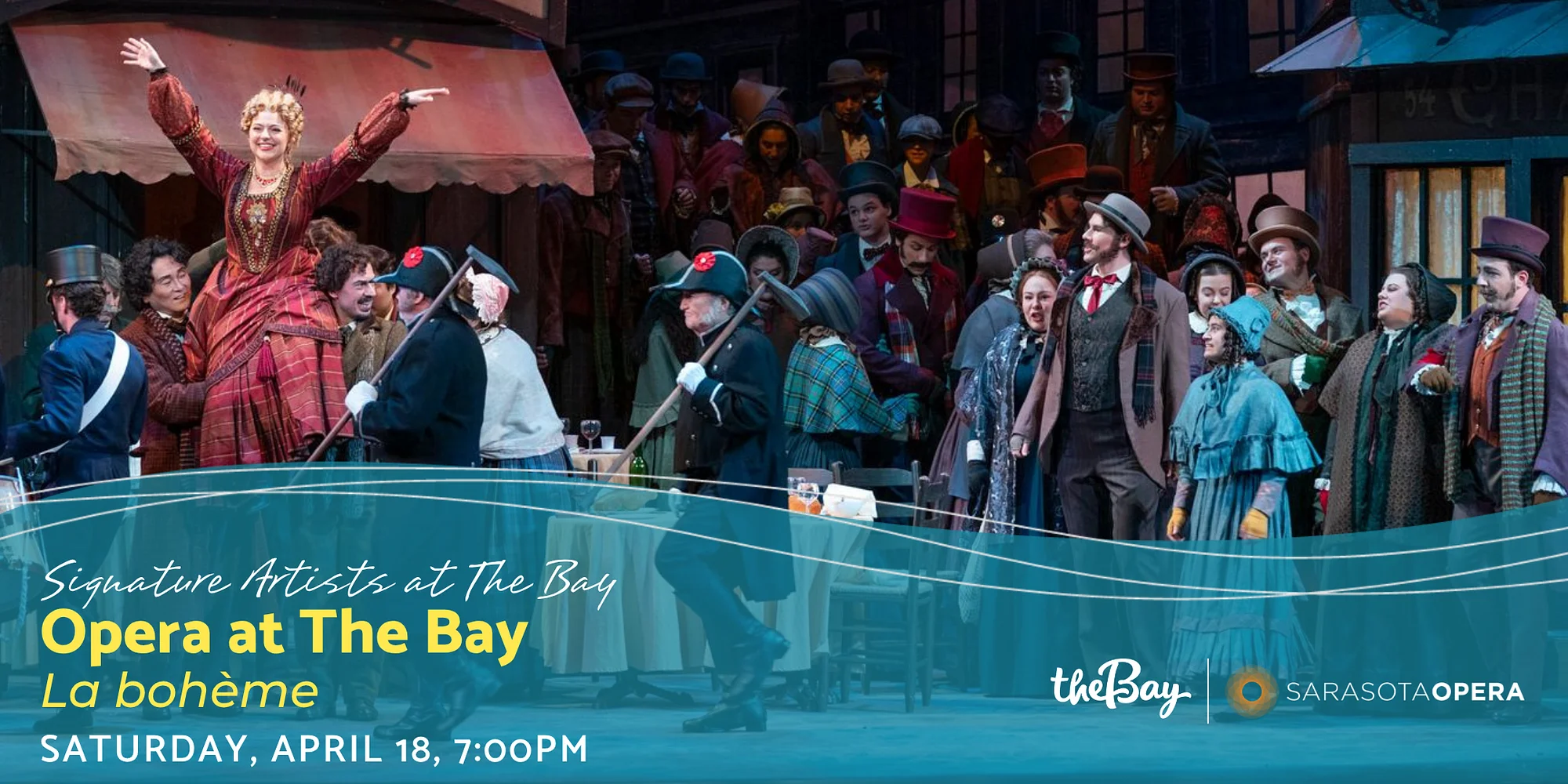 Opera at The Bay: La bohème Saturday, April 18 CLICK HERE TO REGISTER Sarasota Opera and The Bay partner again to present a FREE series of recorded opera screenings from Sarasota Opera’s 2026 Winter Festival. For a limited time only, these exclusive in-park screenings on the stadium-quality LED screen will feature professionally recorded versions of each opera performed inside the historic Sarasota Opera House during the recently-completed season. So bring your friends and family to the park to watch the excitement and vibrance of opera within the beauty of this “One Park for All” along Sarasota Bay. Use this as an opportunity to introduce your friends, kids and grandkids to this captivating genre of performing artistry. Come as you are… no experience required. About La bohème Poetry, poverty, and passion in 1830s Bohemian Paris. Puccini’s most beloved opera explores poetry, poverty, and passion in 1830s Paris. The story follows the poor embroideress Mimì and the poet Rodolfo as they navigate love, friendship, and heartbreak in the Latin Quarter. One of the most performed operas in the repertoire, La bohème is a timeless portrait of youthful hope and tragic romance. Click here for a digital guide about this famous opera Special Notes You’ll Want to Know: This screening will be preceded by special live performance by the Sarasota Youth Opera, who performed on the main stage as part of the chorus in La bohème. Arrive by 6:50 PM for a fast, 5-minute Opera “Primer” led by a member of the Sarasota Opera team—an essential preview of the plot, characters, and standout arias, plus insider tips and fun facts to enhance your screening experience. Register to Win! Register for and attend this event to be entered into a raffle to win a set of free tickets to an upcoming opera performance during the 2026/27 Opera Festival. Other Opera at The Bay Events (click on each to learn more) Sat, April 25 | The Merry Widow Sat, May 2| Il trovatore Buon appetito! Come Hungry and Thirsty! Enjoy watching opera with delicious food and beverage (including Italian wine!) at The Nest Café. About Sarasota Opera Sarasota Opera produces impassioned opera performances true to the vision of the composer, to entertain, enrich, educate, and inspire a life-long love of opera in our diverse and growing communities. This is Sarasota Opera’s 67th Season of bringing world-class opera to Florida’s Gulf Coast. Tips for an enjoyable visit: PLEASE BRING YOUR LAWN CHAIR TO ENSURE A COMFORTABLE SEAT. The Bay park address is 1055 Blvd of the Arts, Sarasota FL 34236 Free parking is located around the site and all parking lots remain open — along Blvd of the Arts and in front of the Van Wezel, Municipal Auditorium and Blue Pagoda. Please avoid parking in designated Sarasota Orchestra parking areas. Construction of the new Town Square (located between the Municipal Auditorium and Art Center) is underway and affects pedestrian routes between the parking lot along N. Tami...