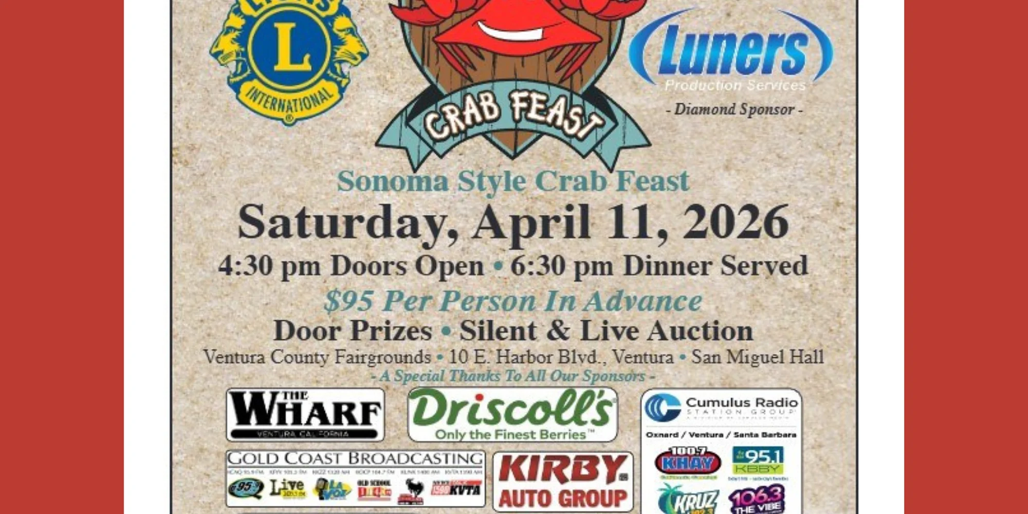 Get ready for one of Ventura’s most anticipated spring traditions! Join the Ventura Downtown Lions for our 15th Annual Sonoma Style Crab Feast – an unforgettable evening of great food, community spirit, and lively fundraising. Indulge in a delicious Sonoma‑style crab feast while enjoying door prizes, a silent auction, and an exciting live auction featuring unique items and experiences. It’s the perfect way to support local causes while sharing a fantastic meal with friends, family, and fellow community members. April 11 – 4:30pm Cost: $95 per person Parking is free Learn more here!