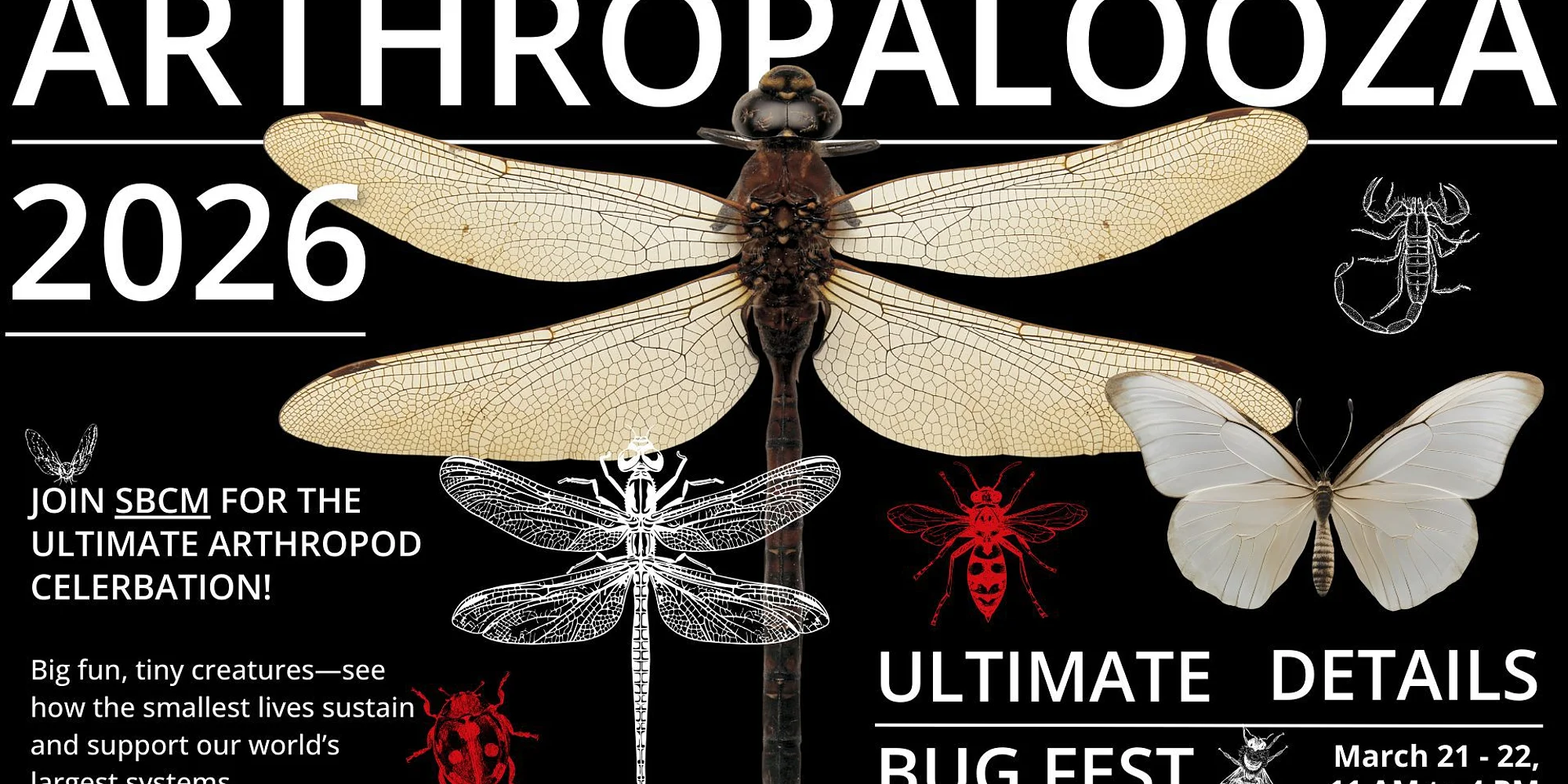 Arthropalooza is a bold, outdoor celebration of the tiny creatures that quietly power our planet. Set in the museum courtyard, this immersive festival transforms an open-air space into a living landscape of discovery—where insects, arachnids, and other arthropods take center stage. Surrounded by fresh air and hands-on activity, visitors can explore close-up encounters, interactive learning stations, and engaging experiences that reveal how these small but mighty organisms shape ecosystems, support food systems, and keep our world in balance. From iridescent wings to remarkable survival strategies, Arthropalooza invites guests to slow down, look closer, and see familiar creatures in an entirely new way. Designed for curious minds of all ages, Arthropalooza blends scientific insight with playful exploration in a relaxed, welcoming environment. Whether you’re a lifelong bug enthusiast or simply curious about the natural world, the courtyard becomes a place to gather, explore, and rethink the role of some of Earth’s most essential inhabitants. Join us March 21 – 22, 11:00 am – 4:00 pm in the museum courtyard. Admission: • $10 adults • $8 military or seniors • $7 students • $5 children ages 6–12 • Free for children five and under • Museum Foundation members are free. Parking is free, and the museum is accessible to persons with disabilities.