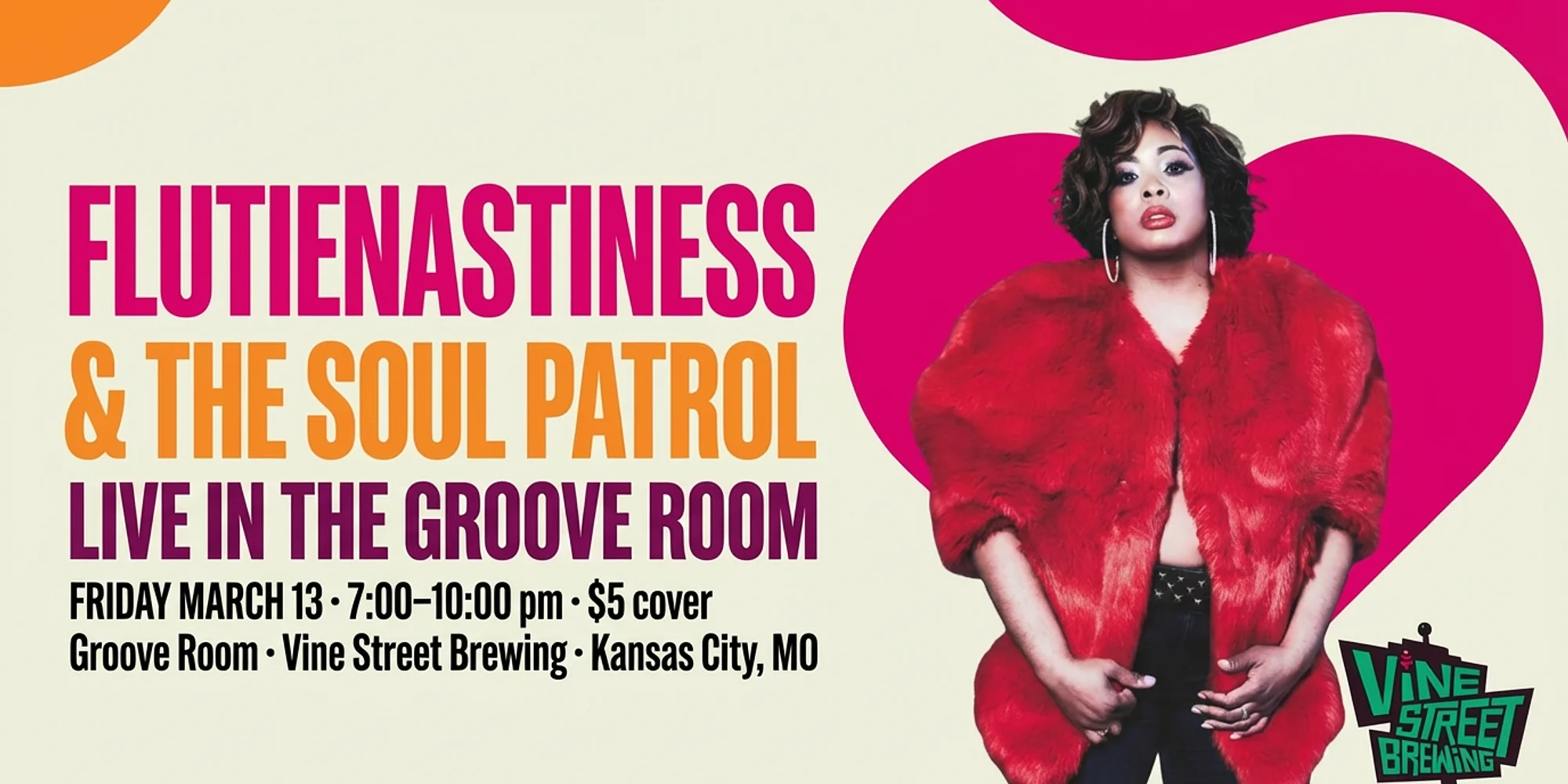 Flutienastiness & The Soul Patrol bring a soulful, flute-led groove to the Groove Room at Vine Street Brewing. Join us Friday, March 13 from 7:00–10:00 pm for a night of live jazz, soul, and funk with cocktails, beer, and good energy on Vine Street. $5 cover · Groove Room at Vine Street Brewing · 2010 Vine Street, Kansas City, MO Flutienastiness & The Soul Patrol Live in the Groove Room $5.00